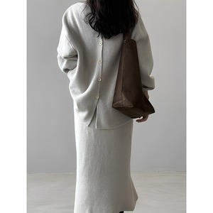 首まわりをすっきり見せるネックラインと、後ろ姿に映えるバックボタンが魅力のセットアップ◎