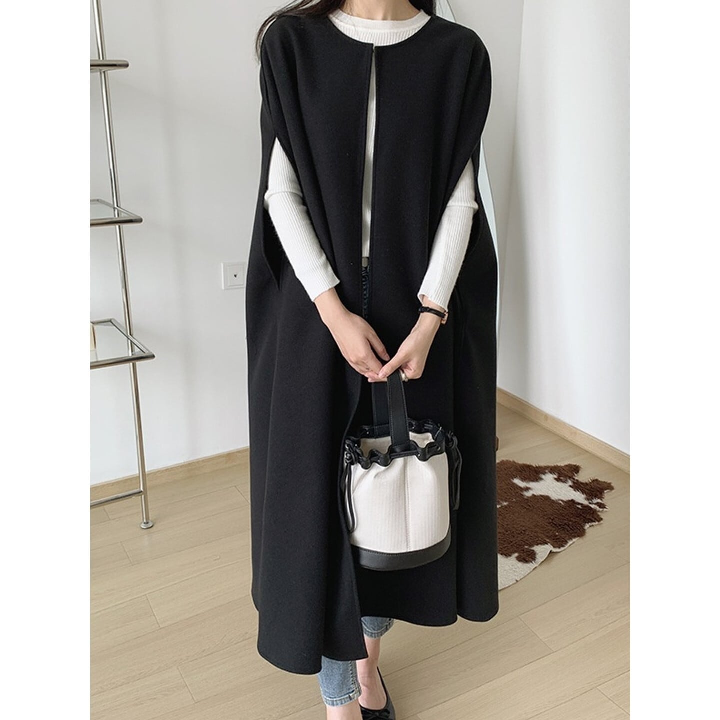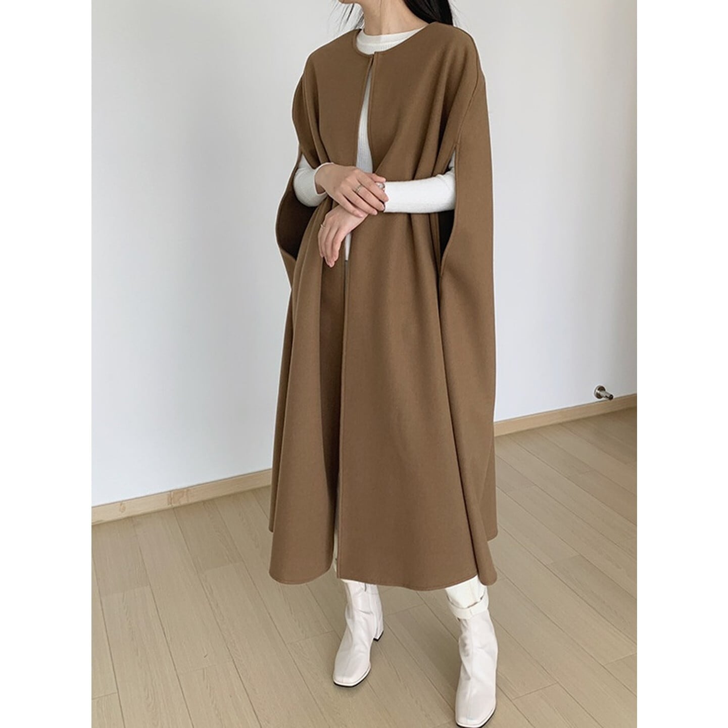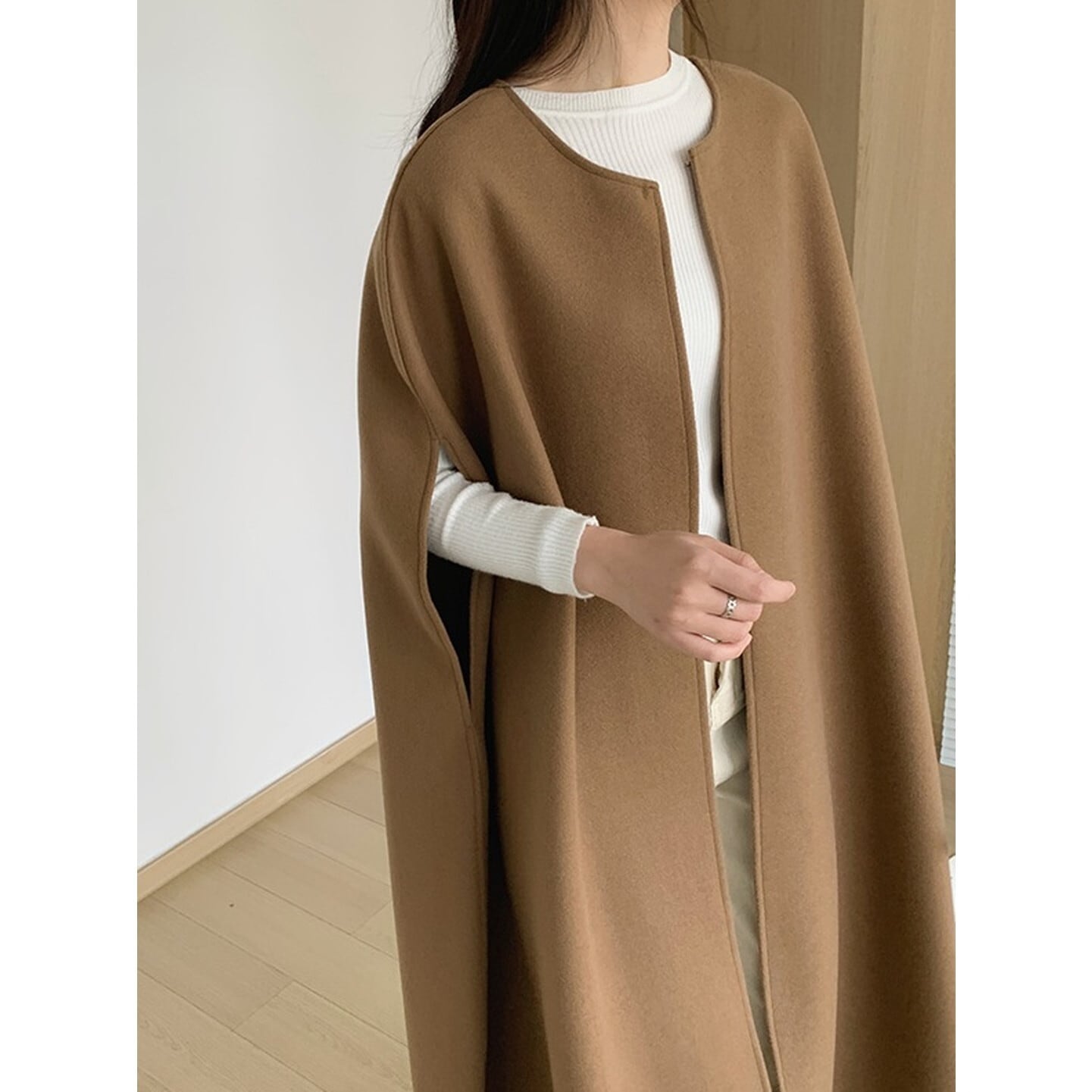 無駄のないデザインが魅力の、ノーカラーのケープ風アウター◎