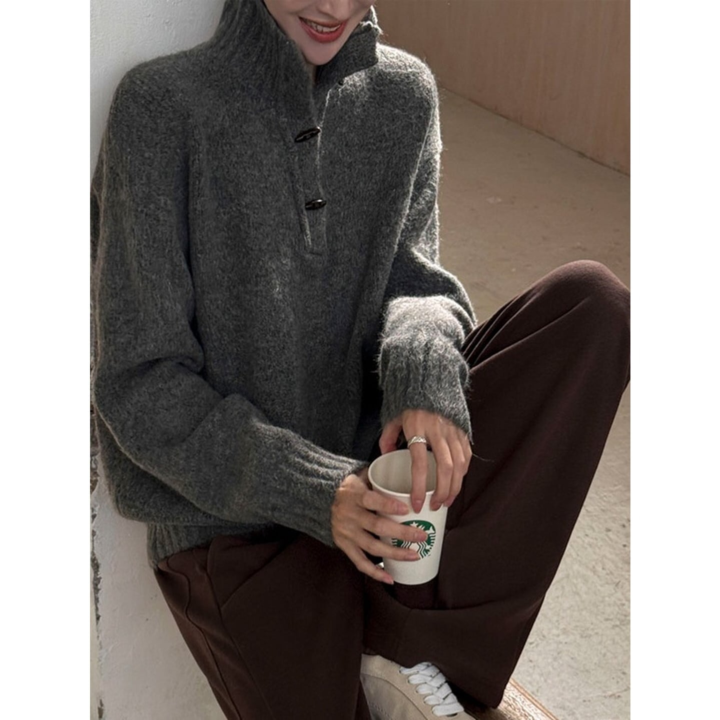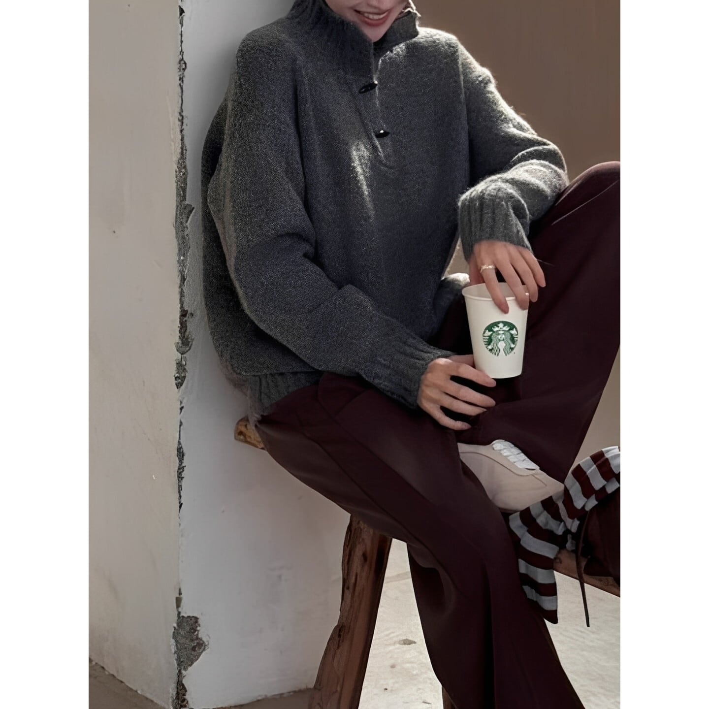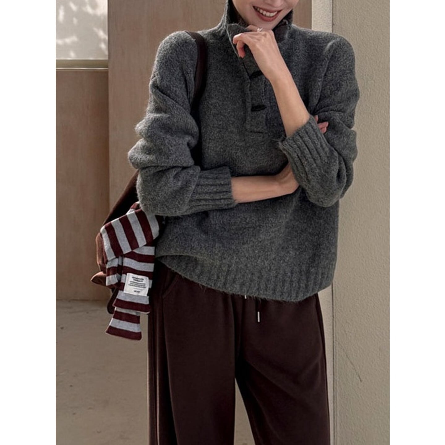 立ち上がりの襟元とトグルボタンがアクセントのニットトップス◎