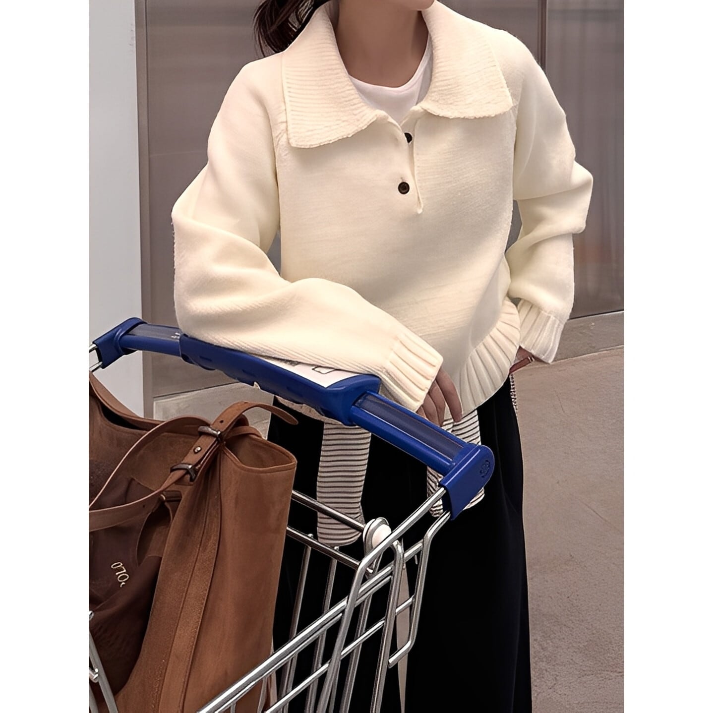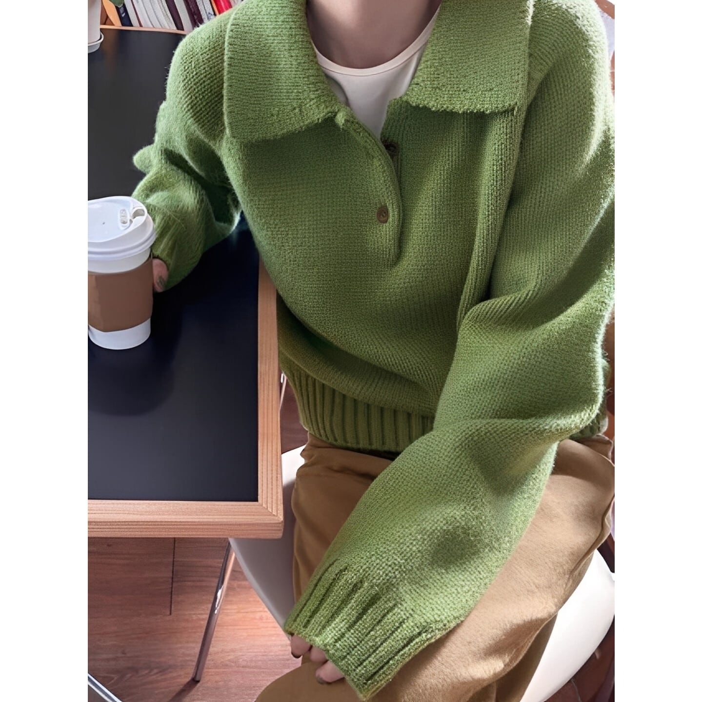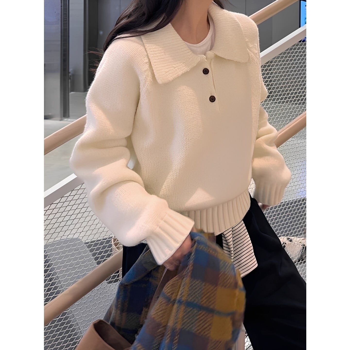 大きめの襟とボタンデザインがポイントのニットプルオーバー。