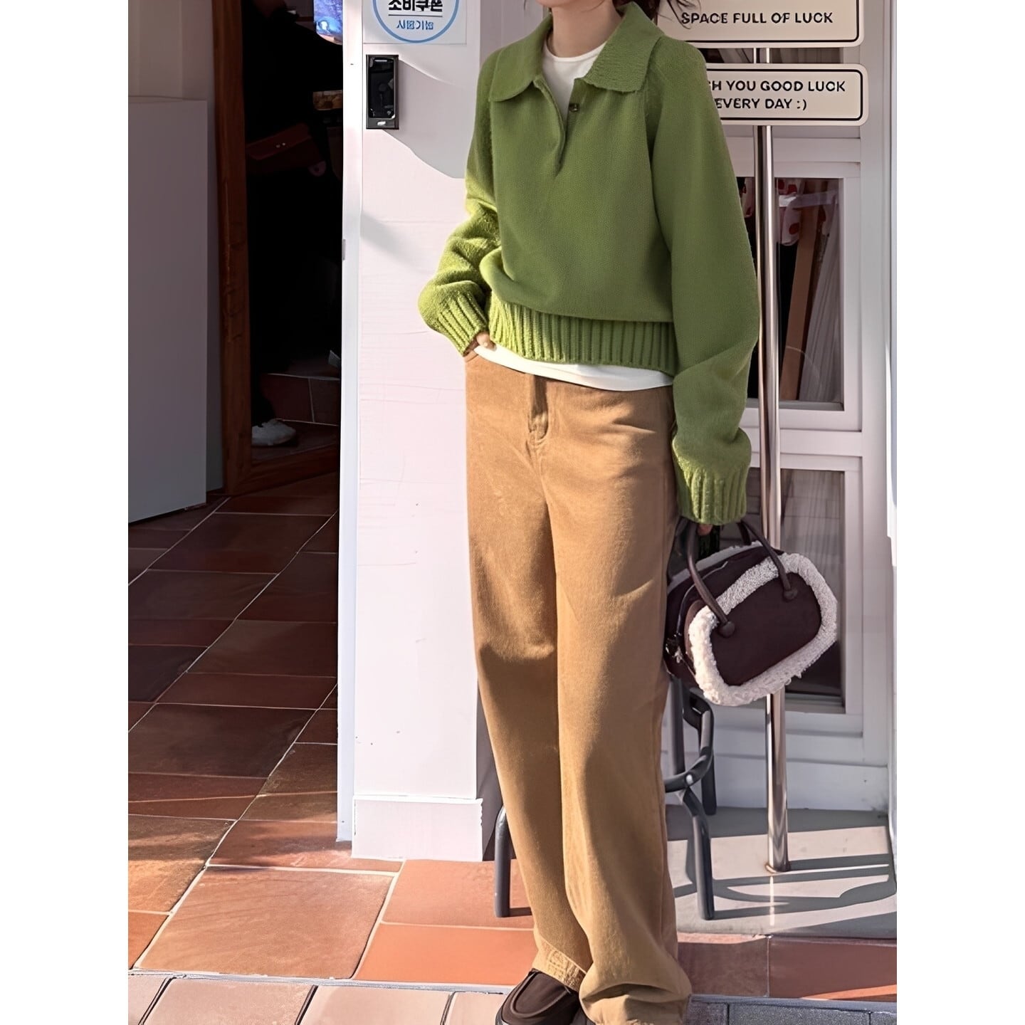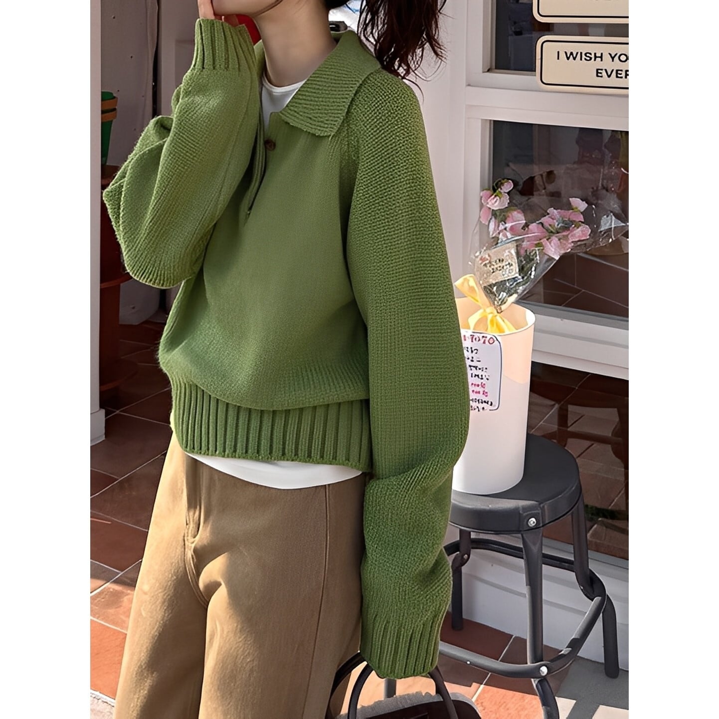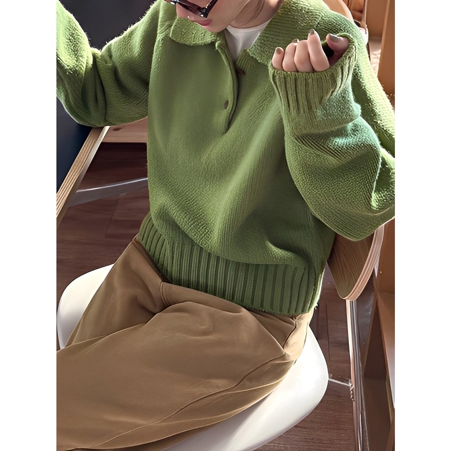 大きめの襟とボタンデザインがポイントのニットプルオーバー。