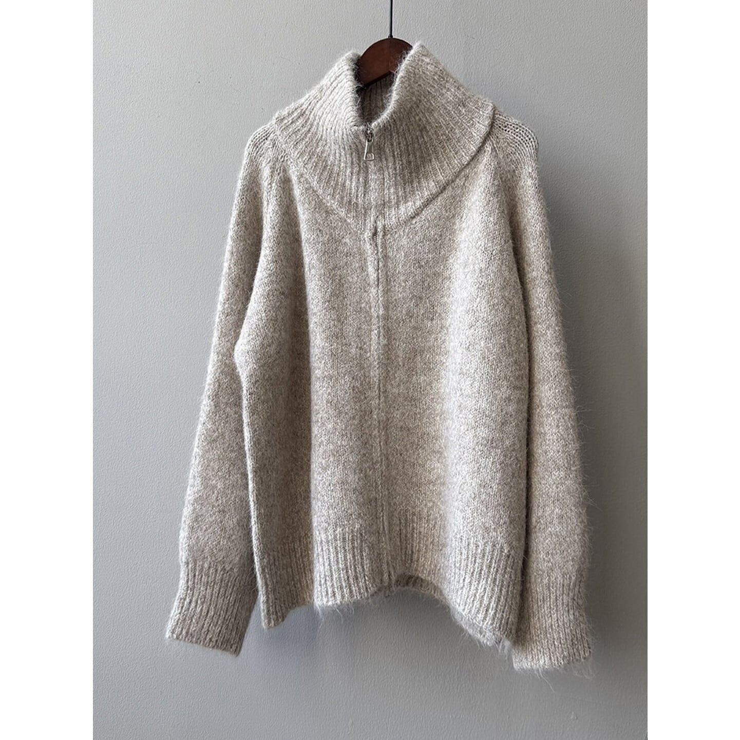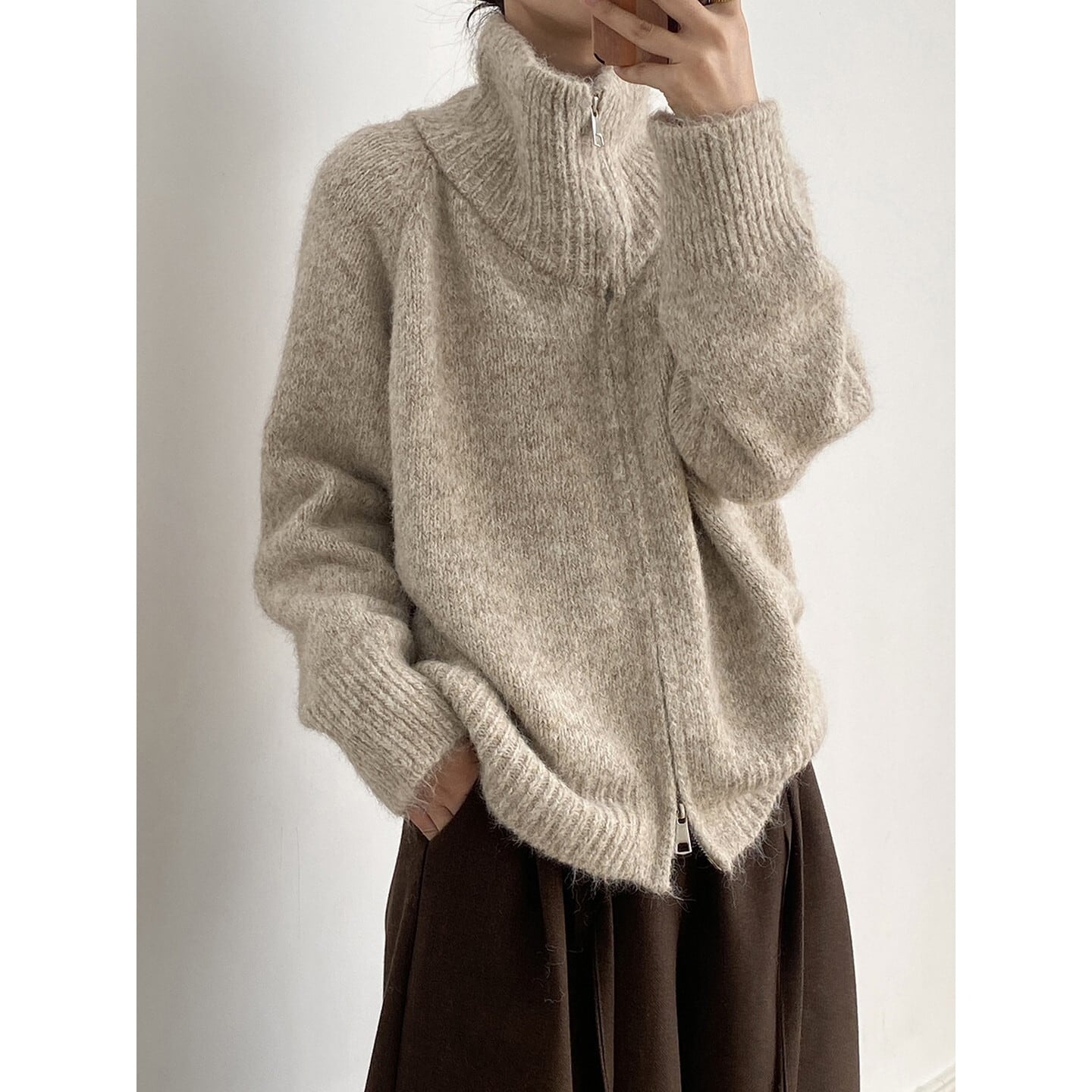 ジップ付きのハイネックが首元の表情を変えられる大人ニット。