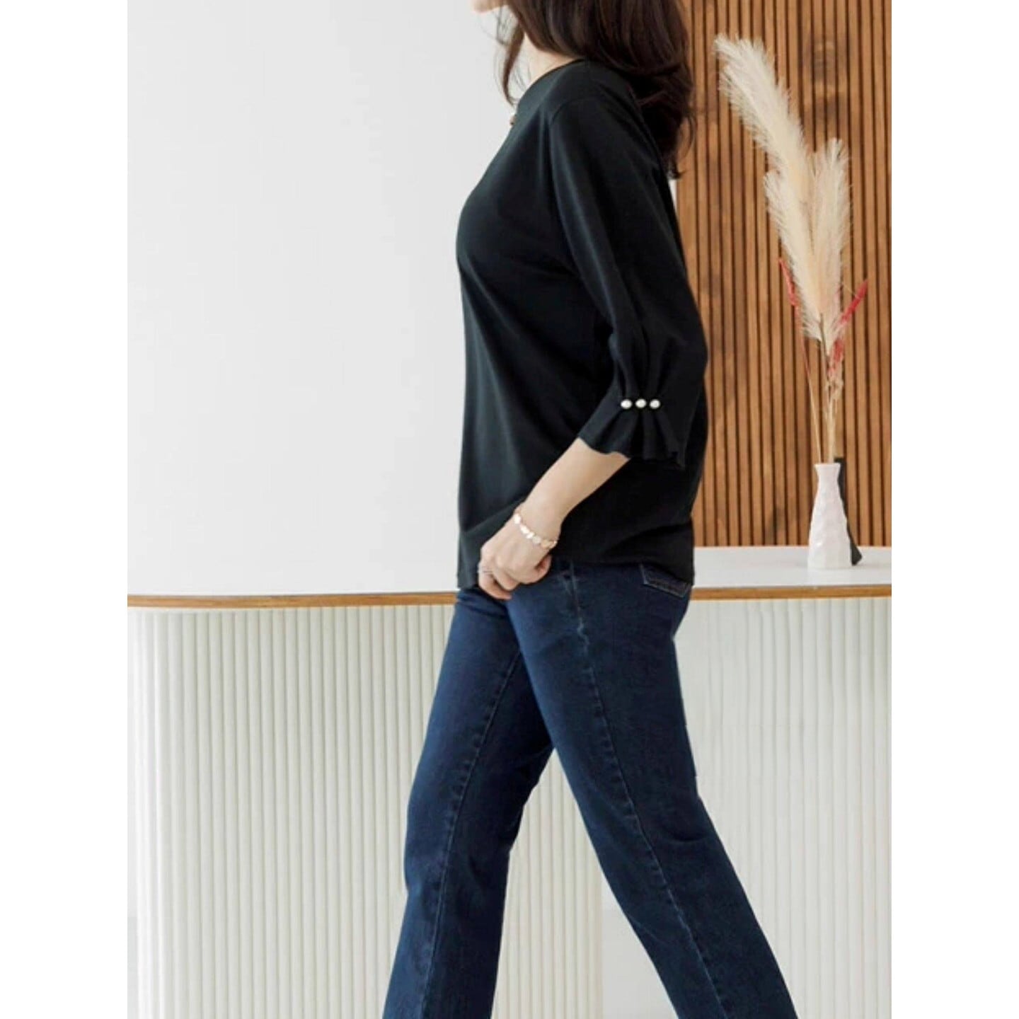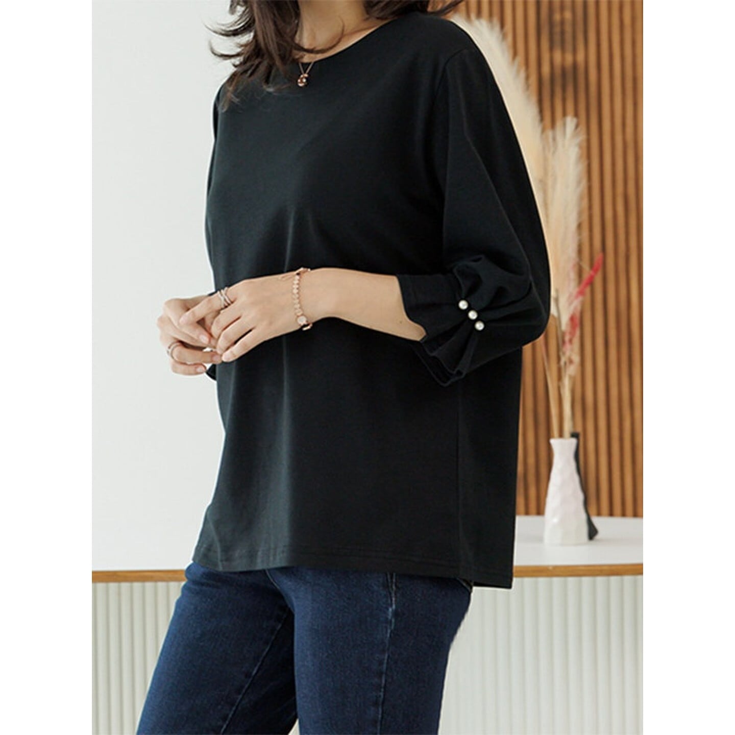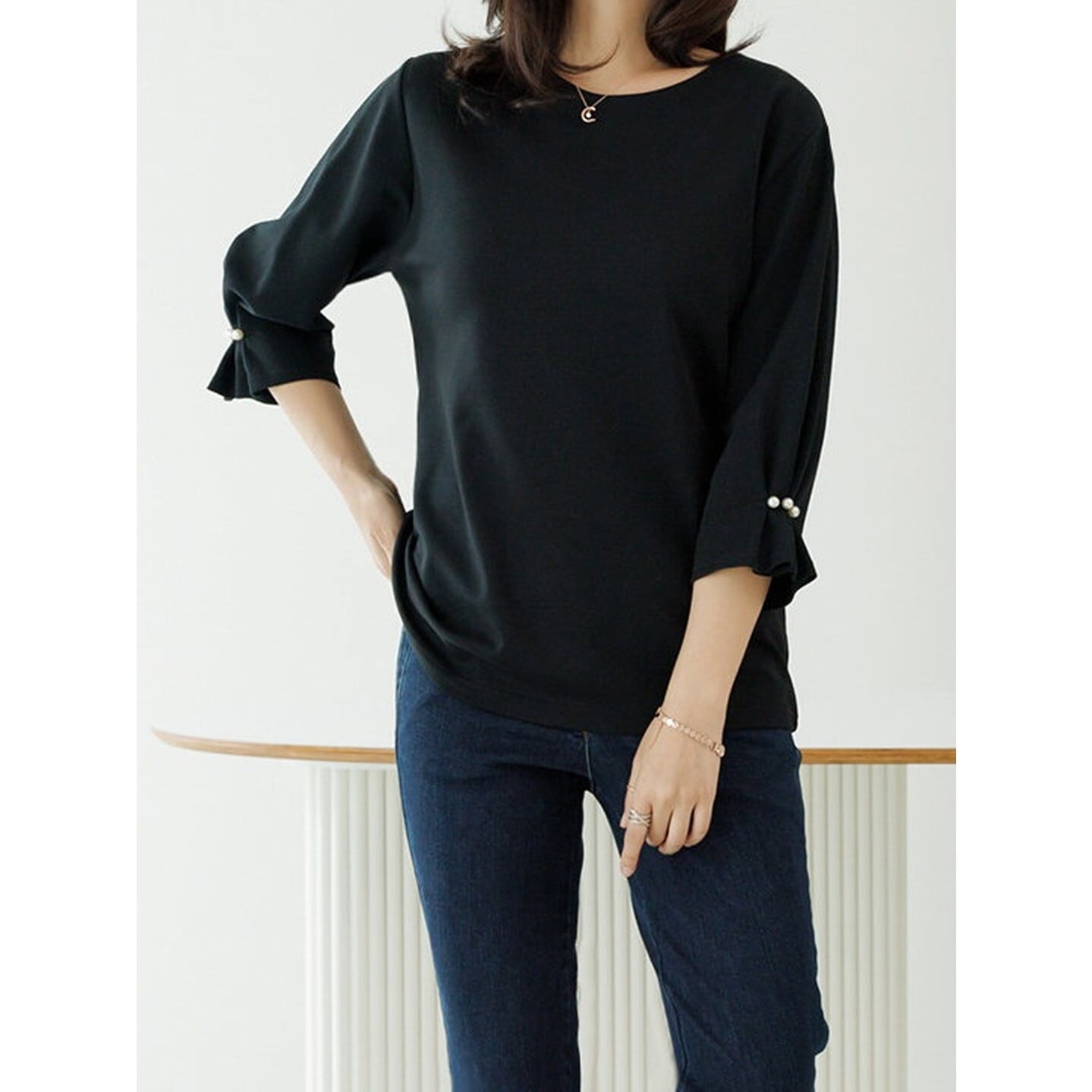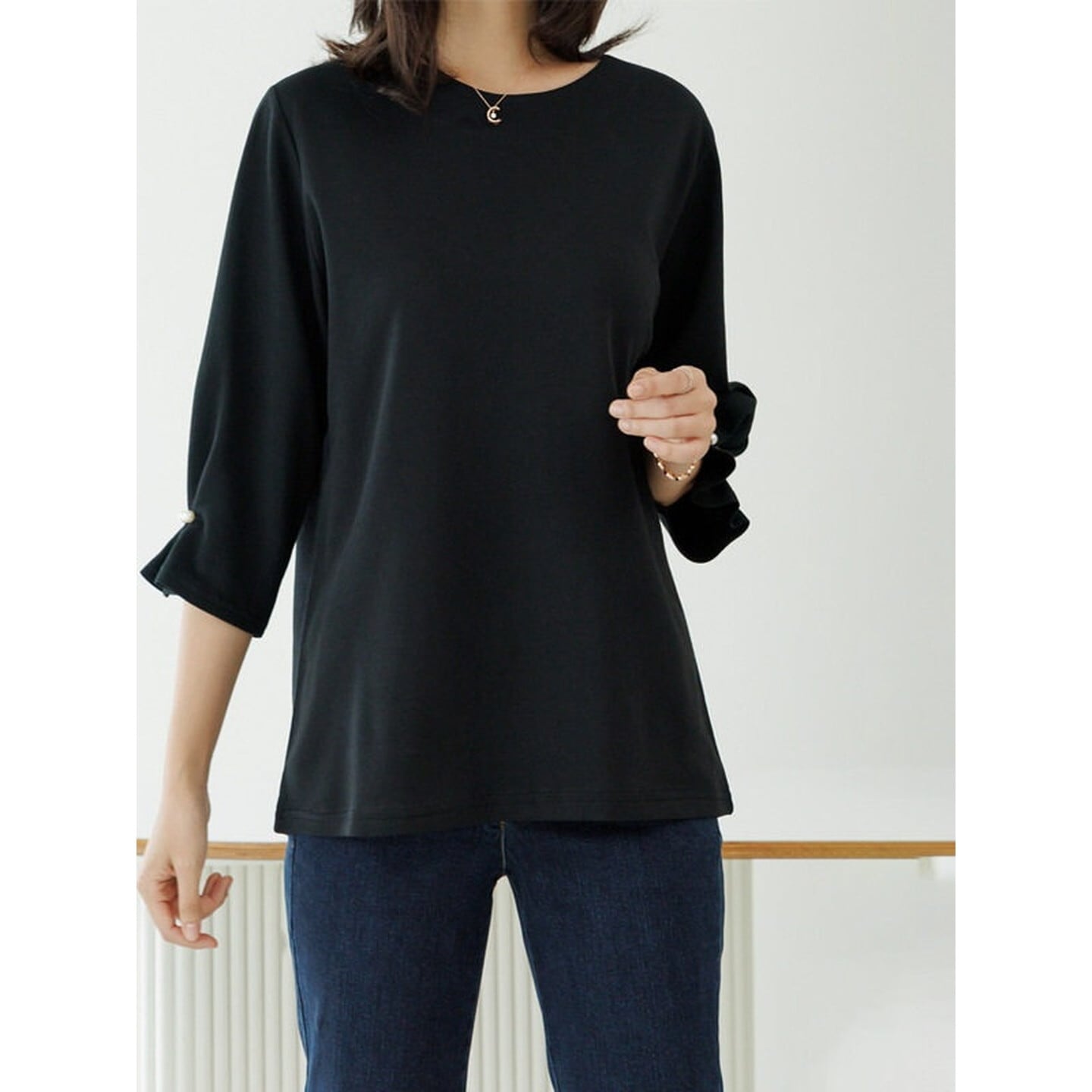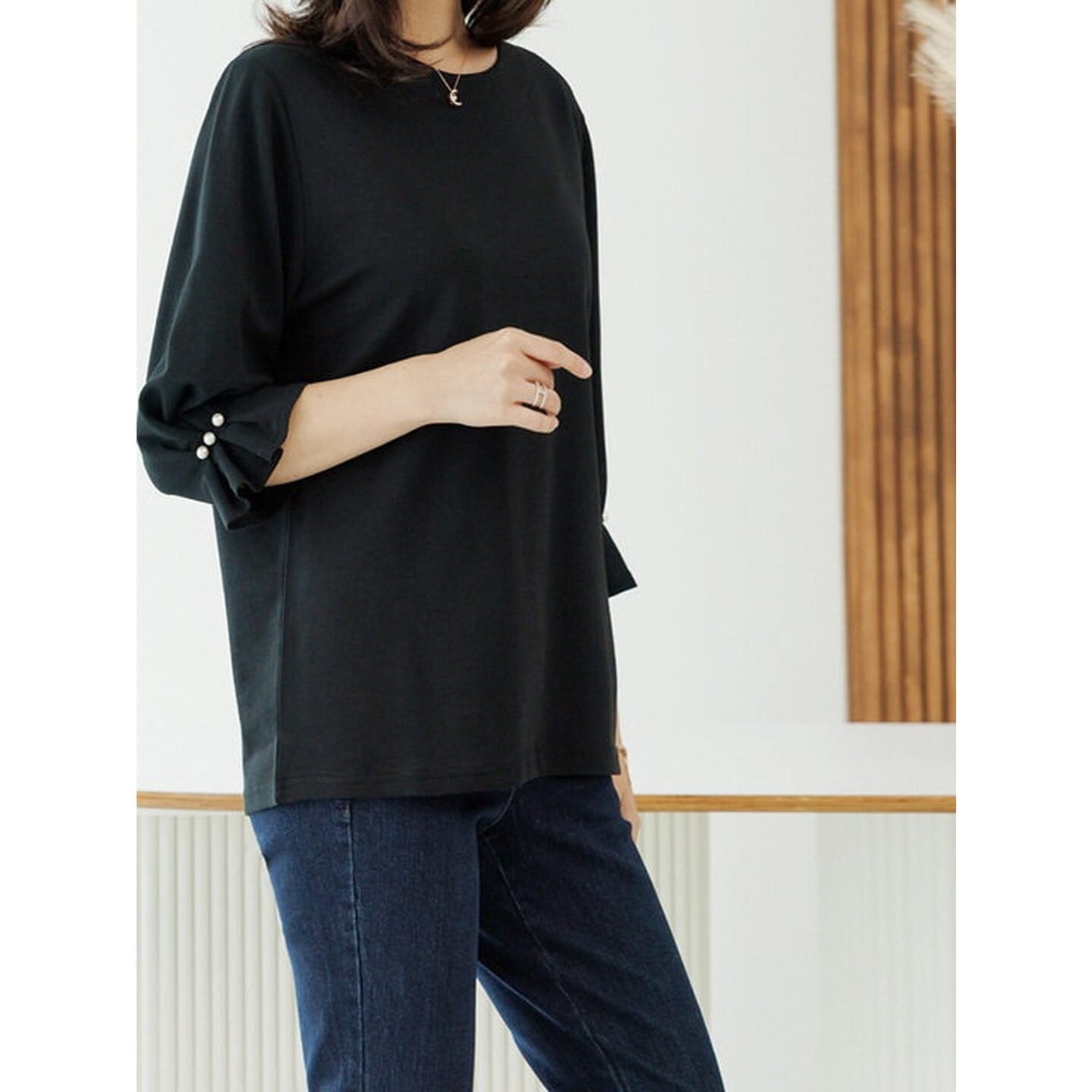 袖口のパールがさりげなく華やかさを添える、大人のTシャツ。