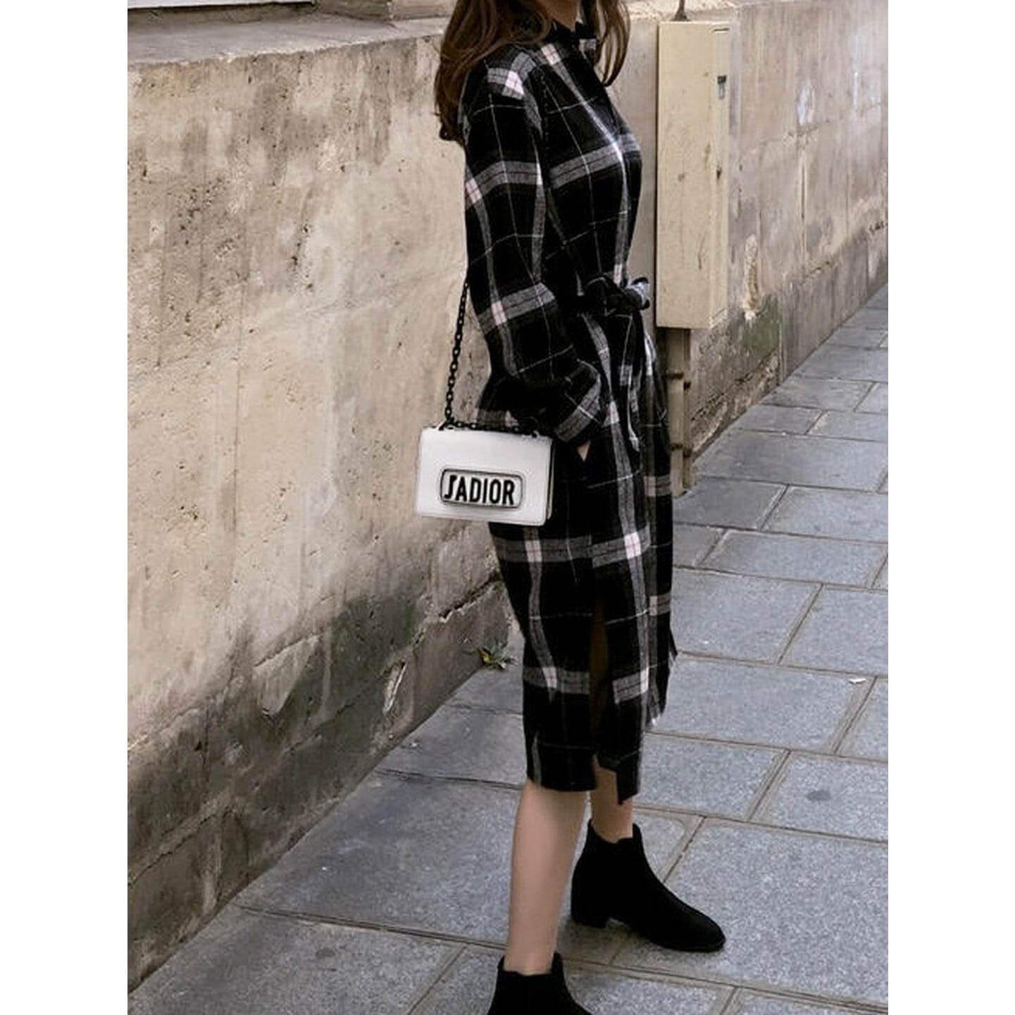 落ち着いたチェック柄に、すっきり見えが叶うウエストマーク◎