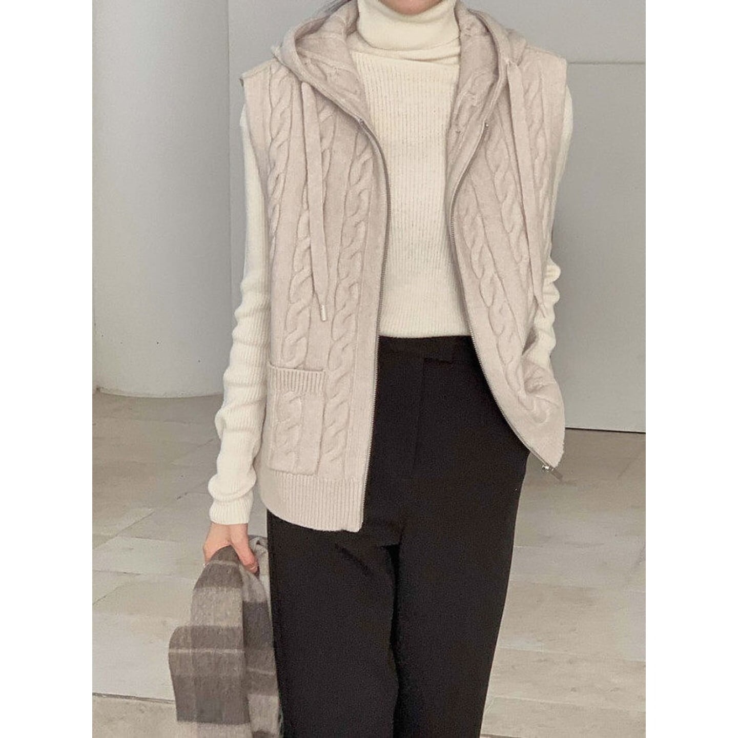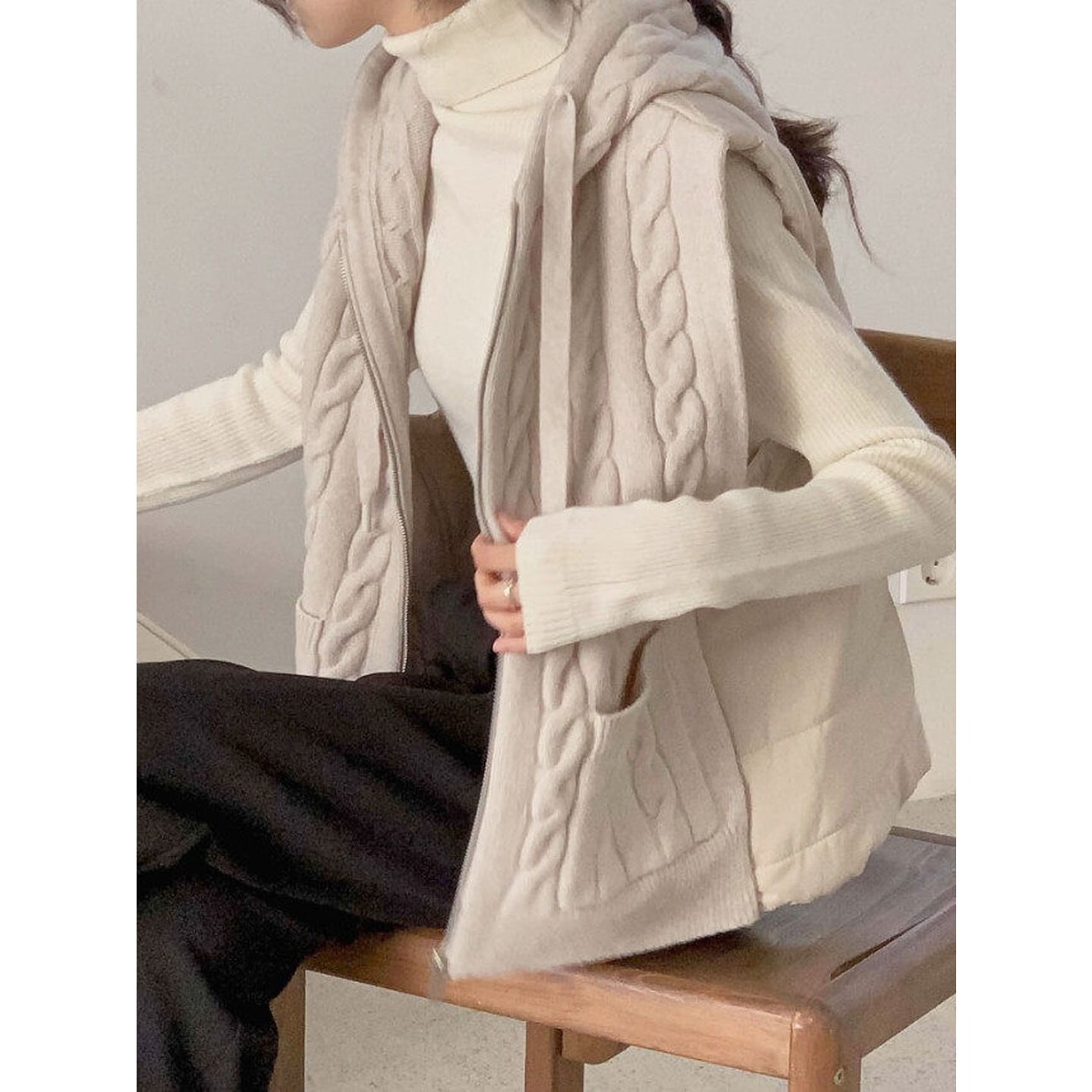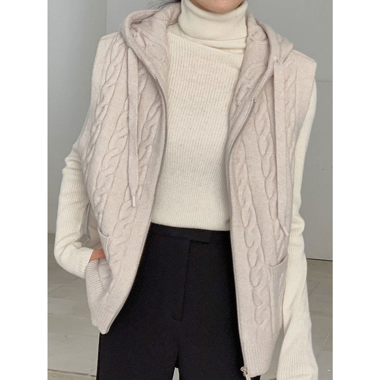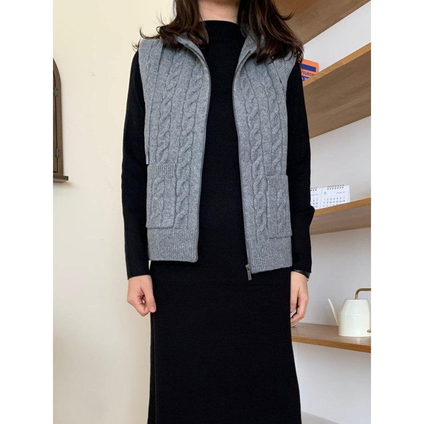 立体的なケーブル編みが、柔らかく上品な印象に。