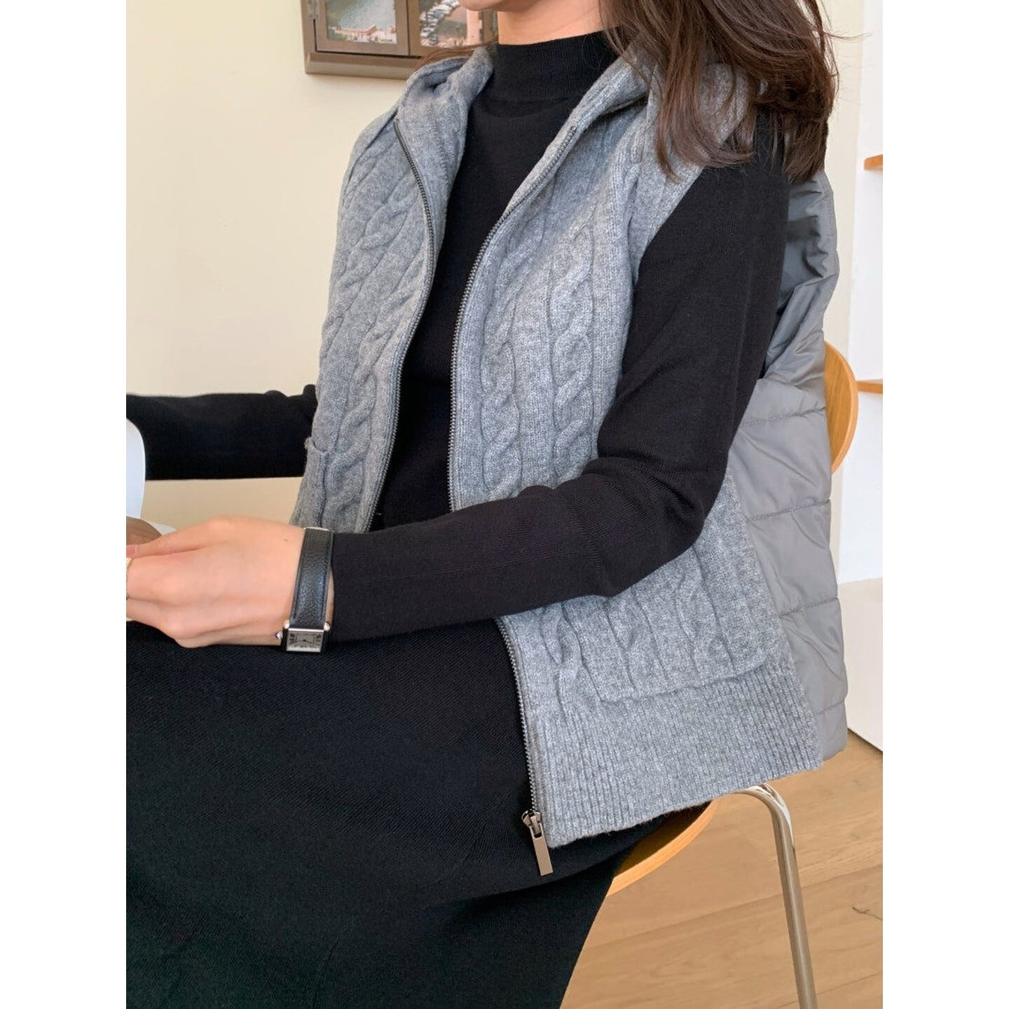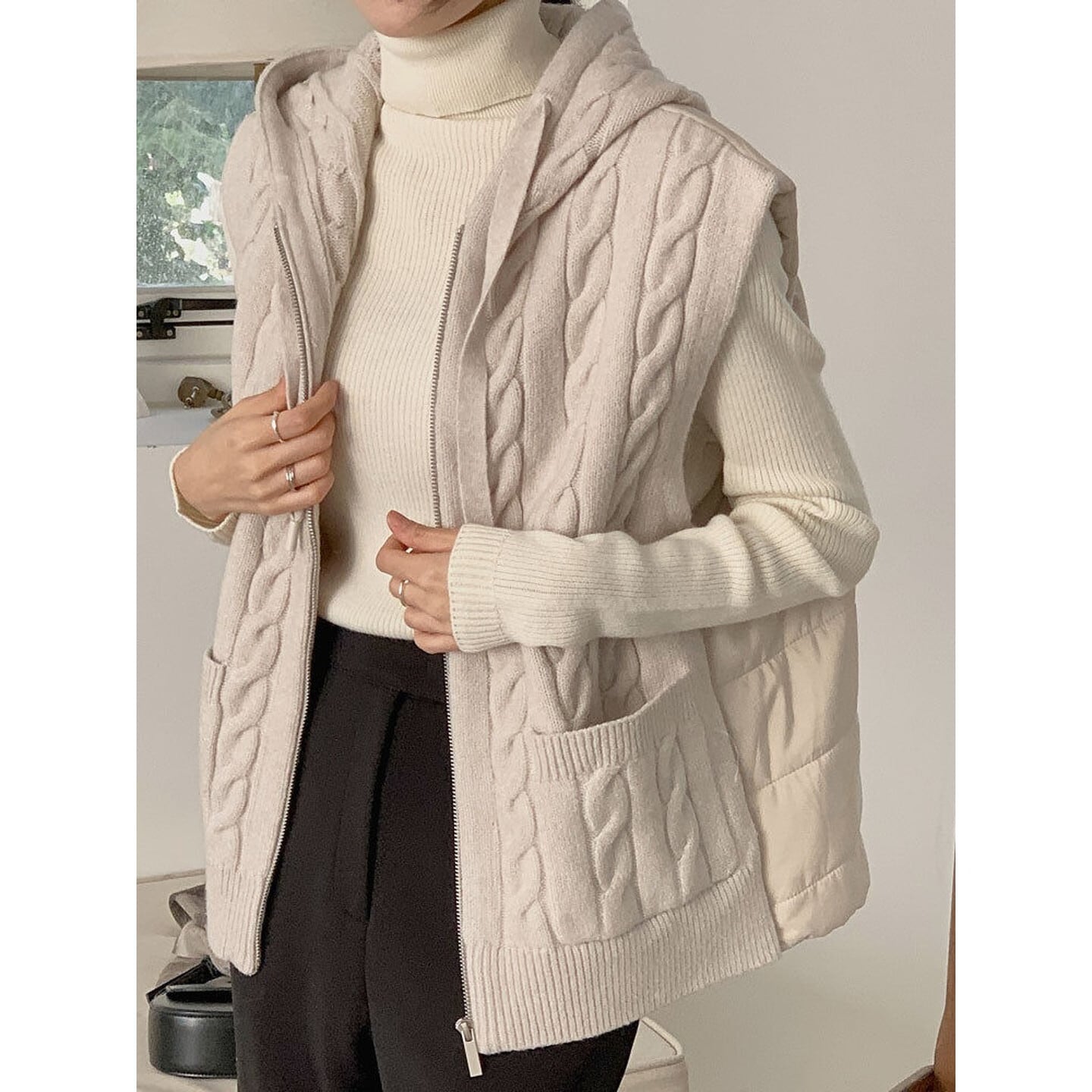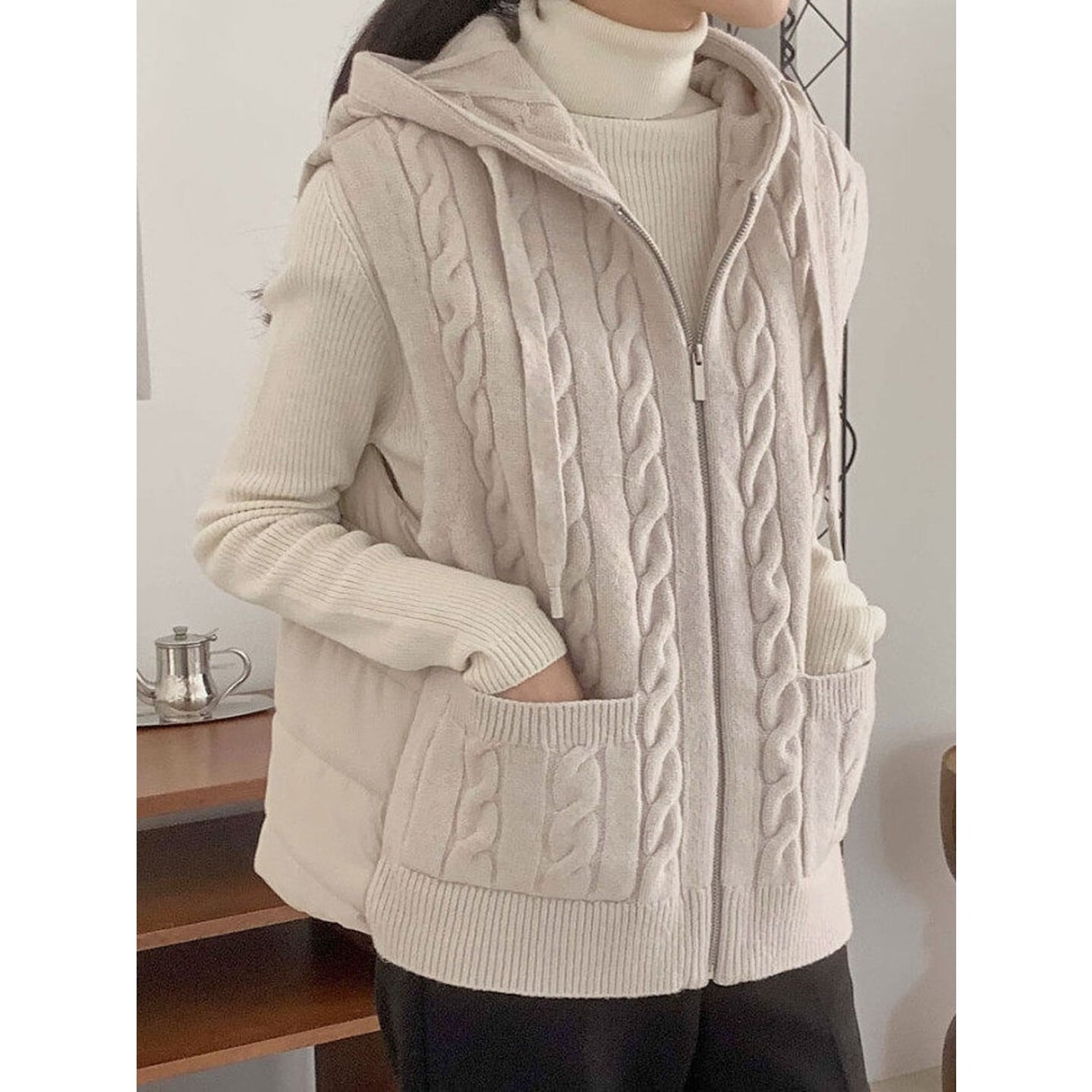 立体的なケーブル編みが、柔らかく上品な印象に。