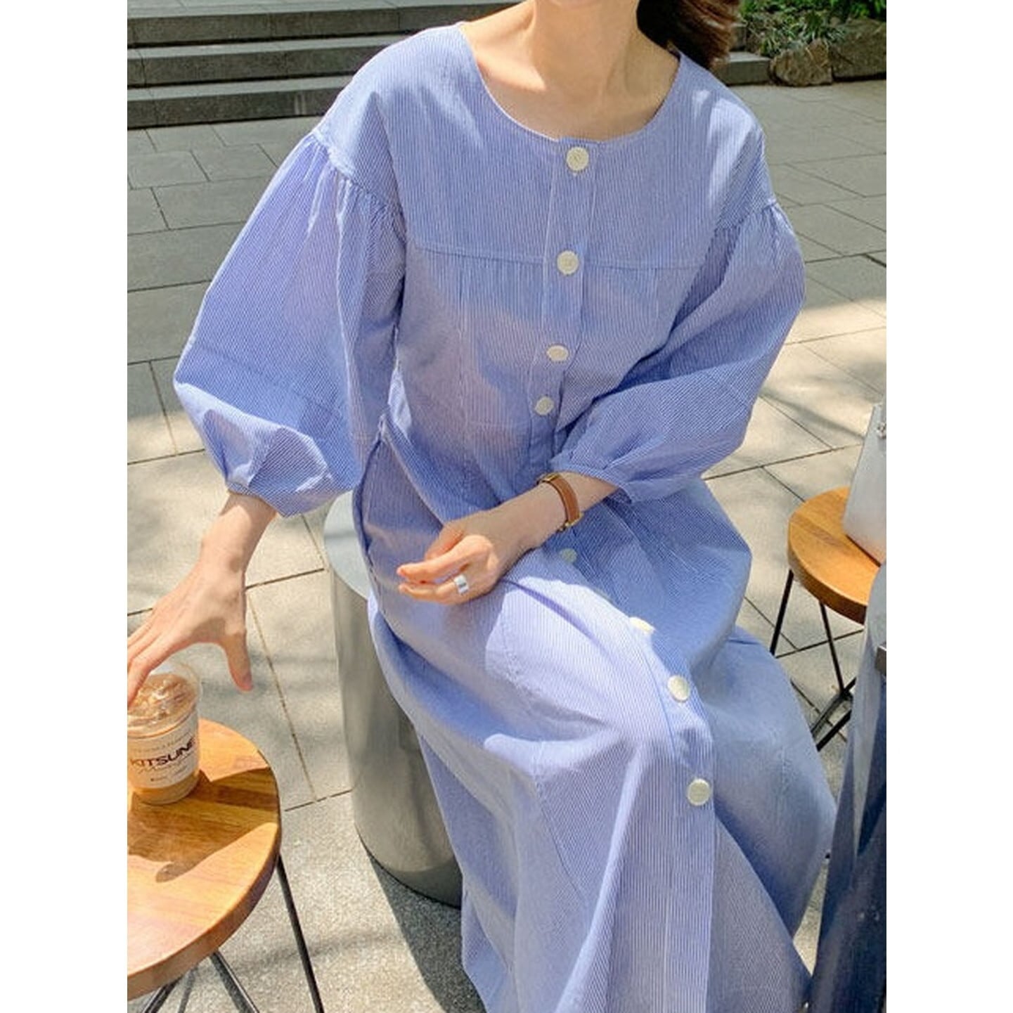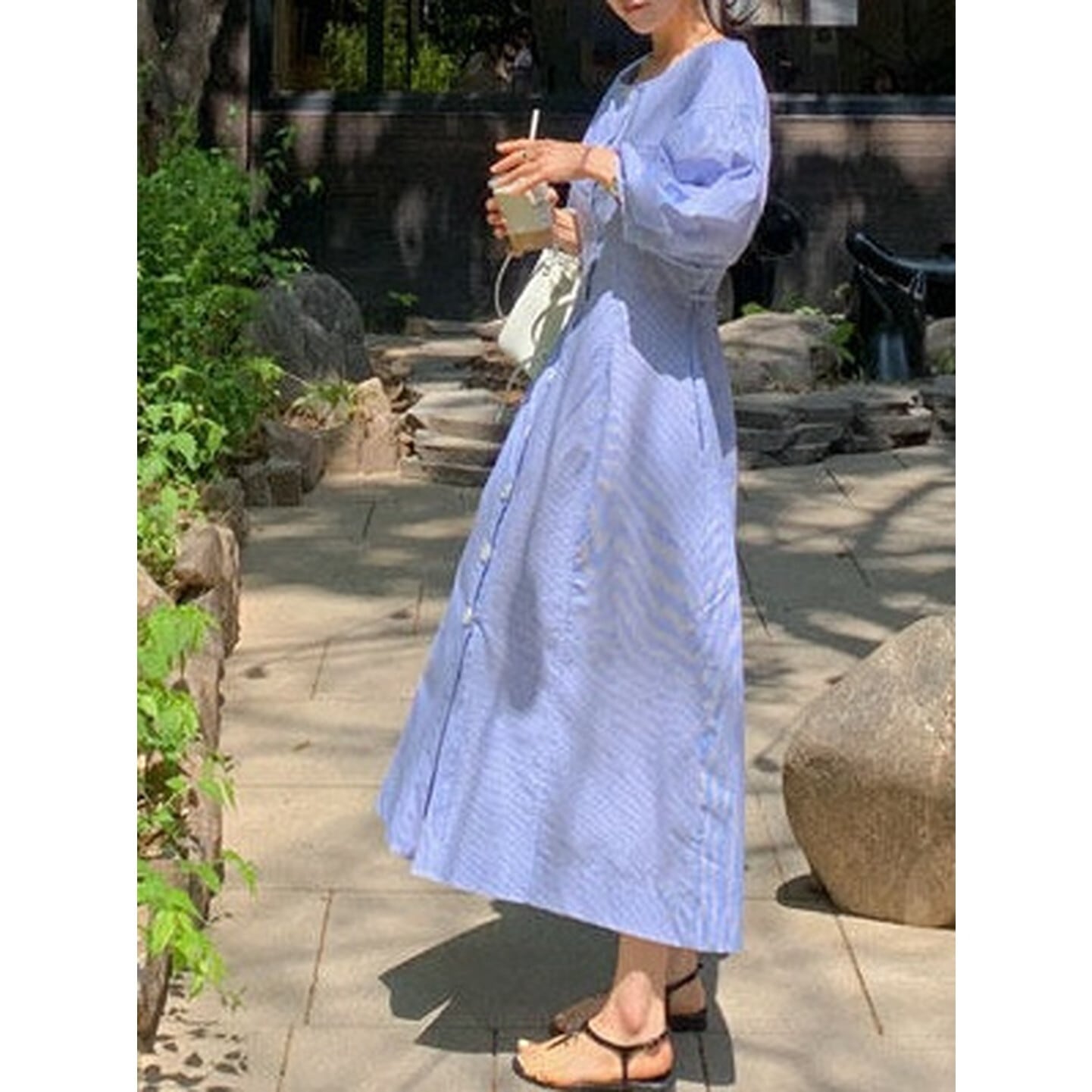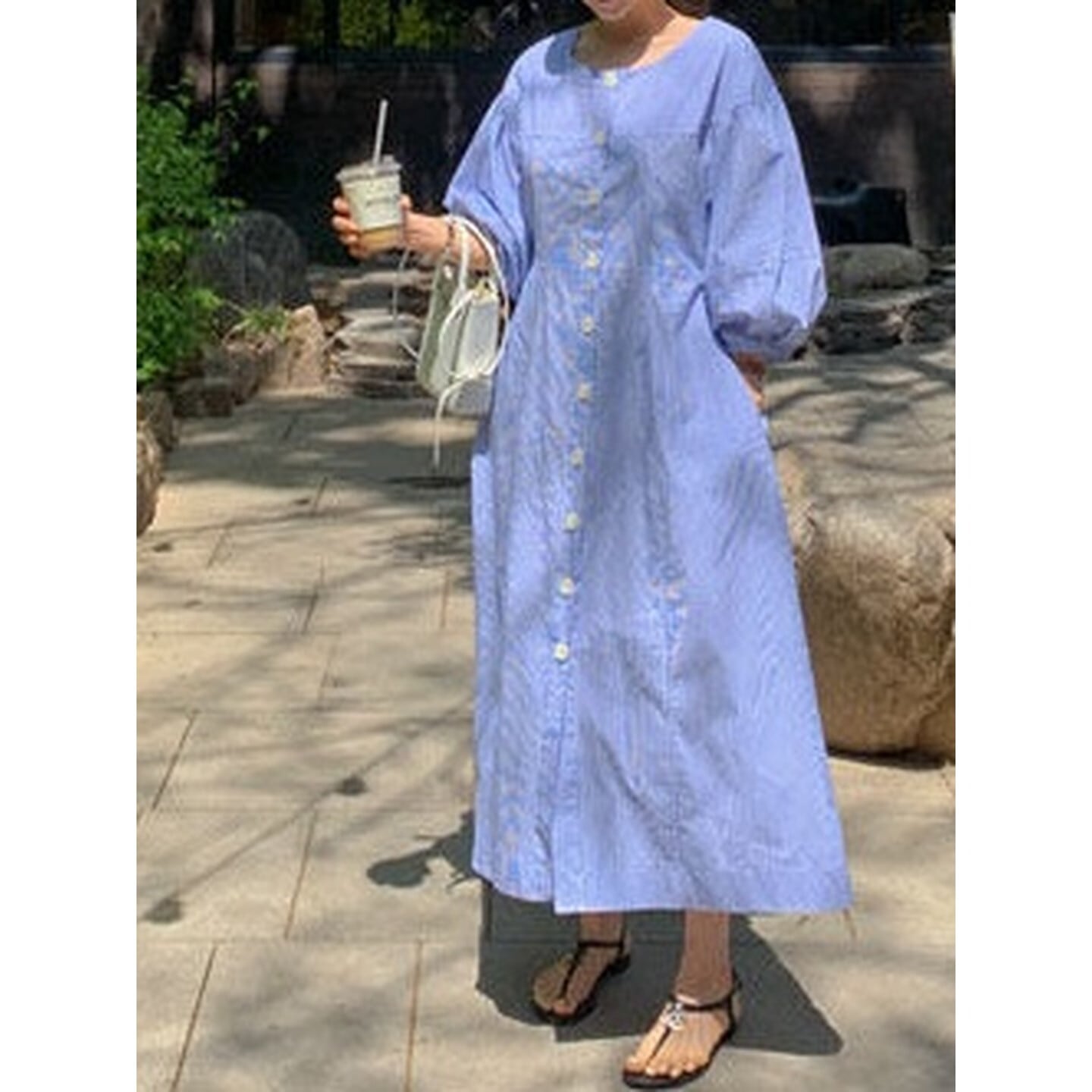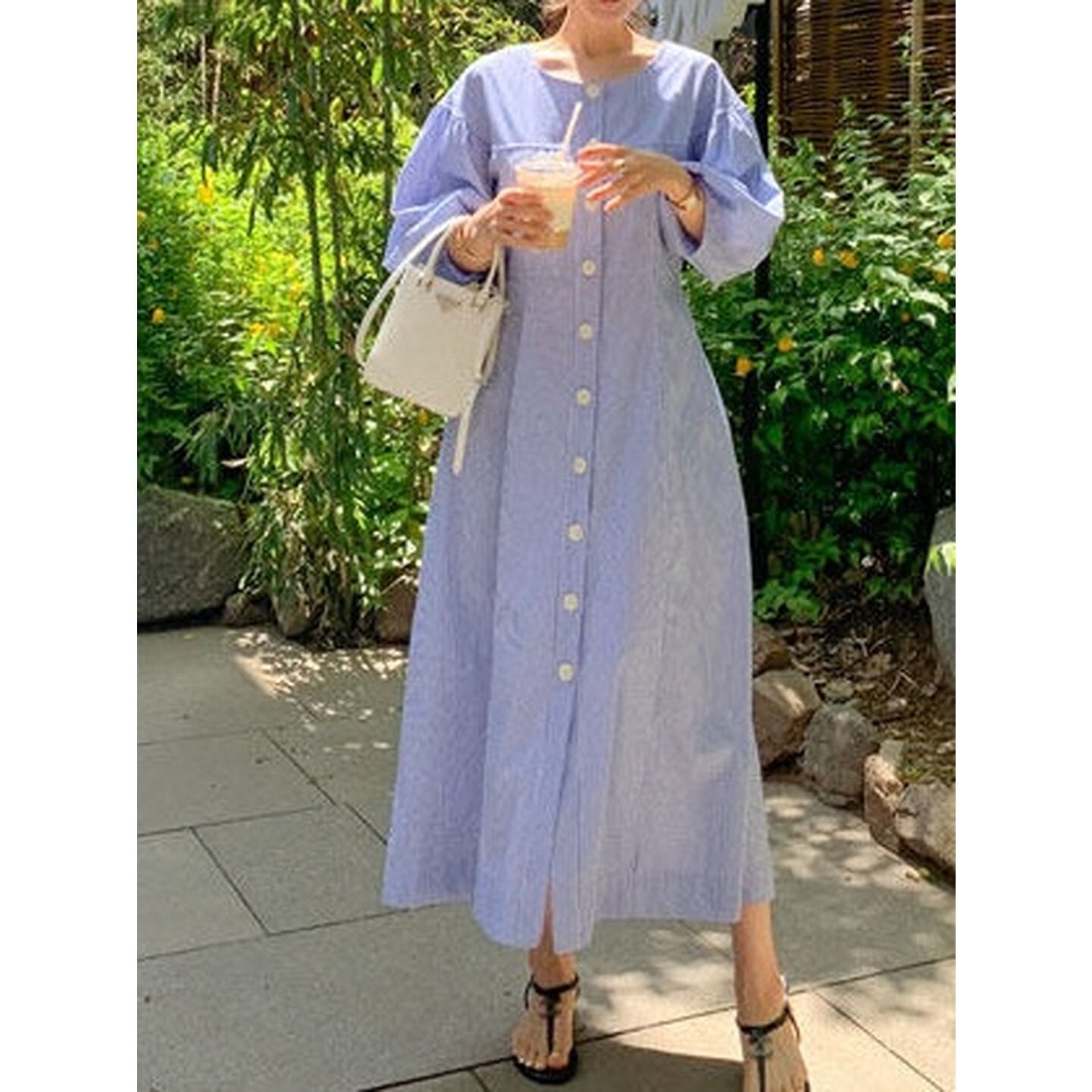 ゆったりとしたシルエットとフロントボタンが、やさしく女性らしい雰囲気を演出。