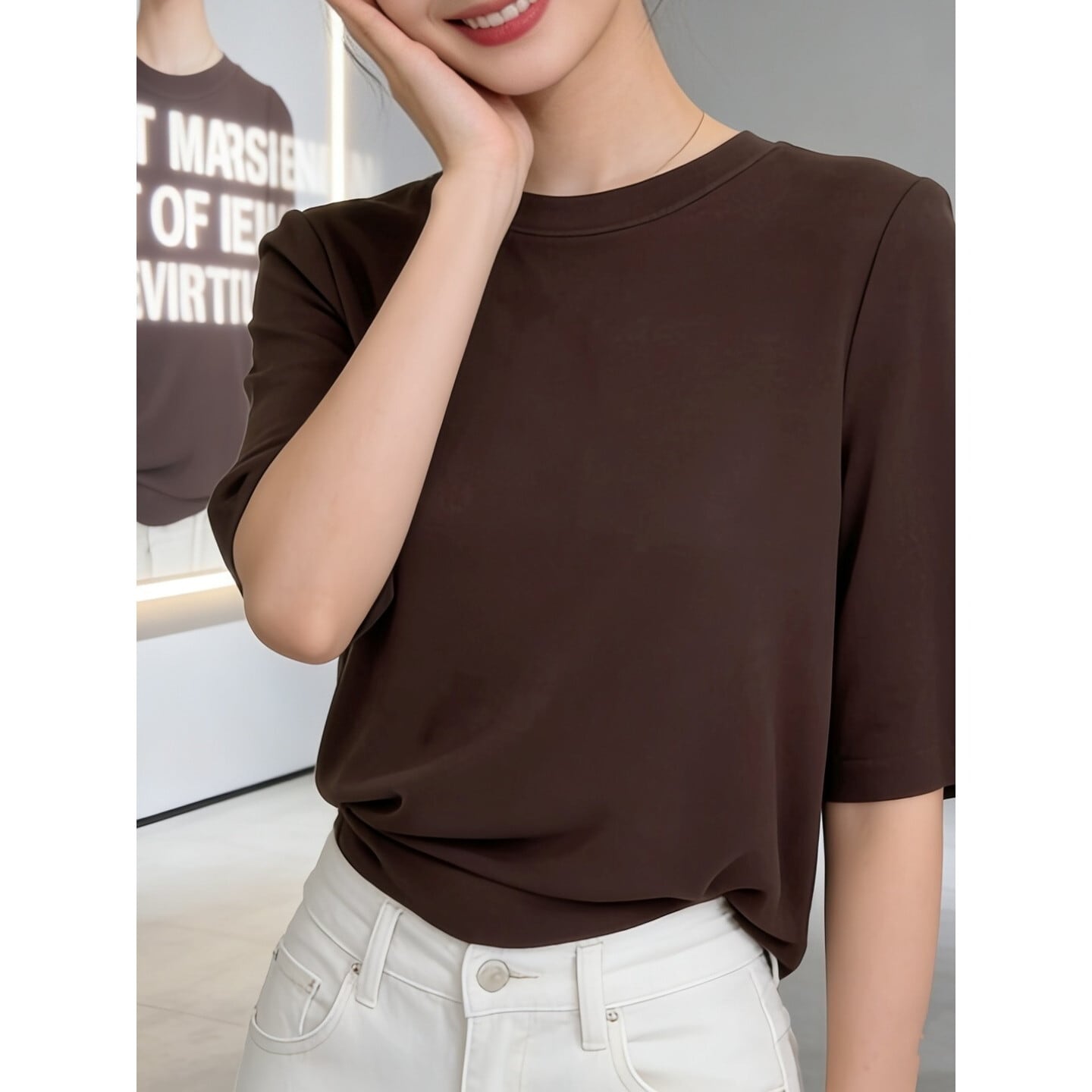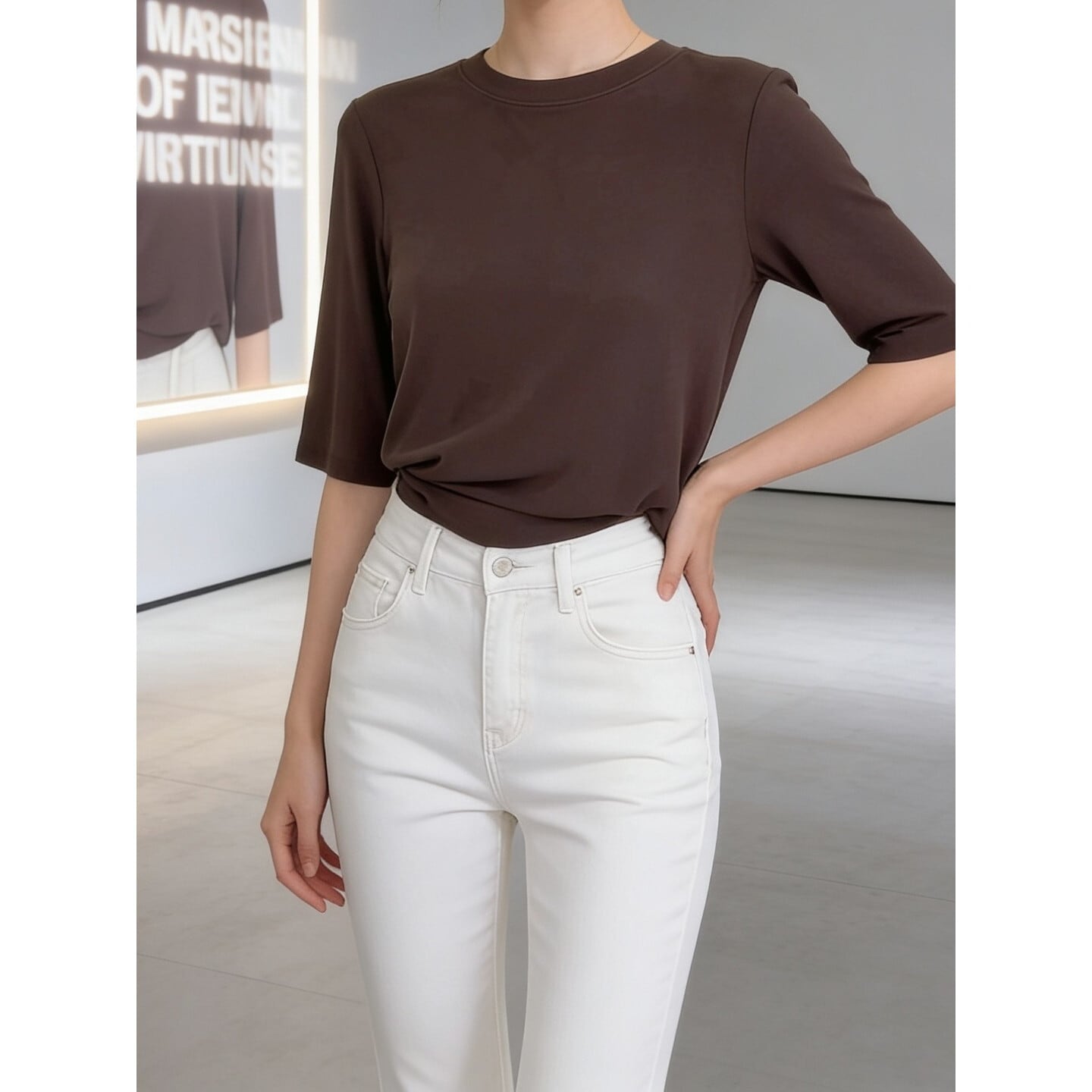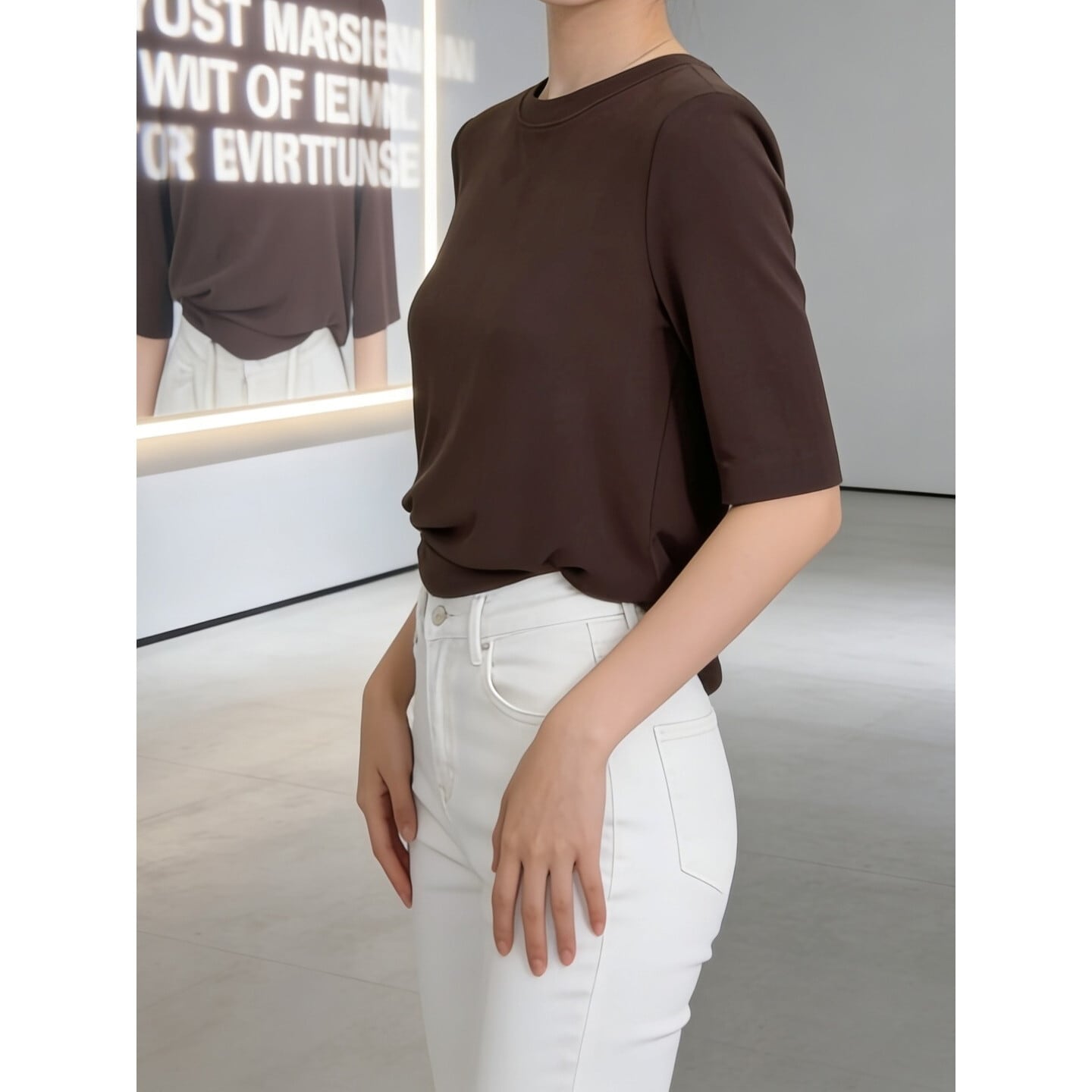 すっきりとしたシルエットが魅力のきれいめ五分袖トップス。
