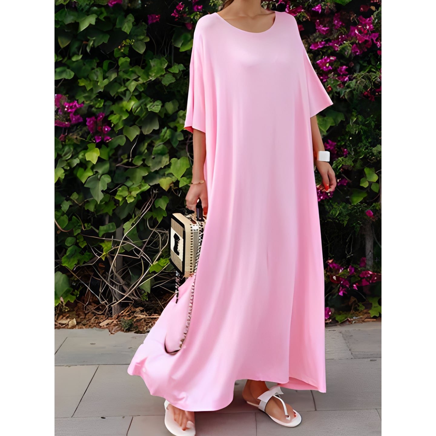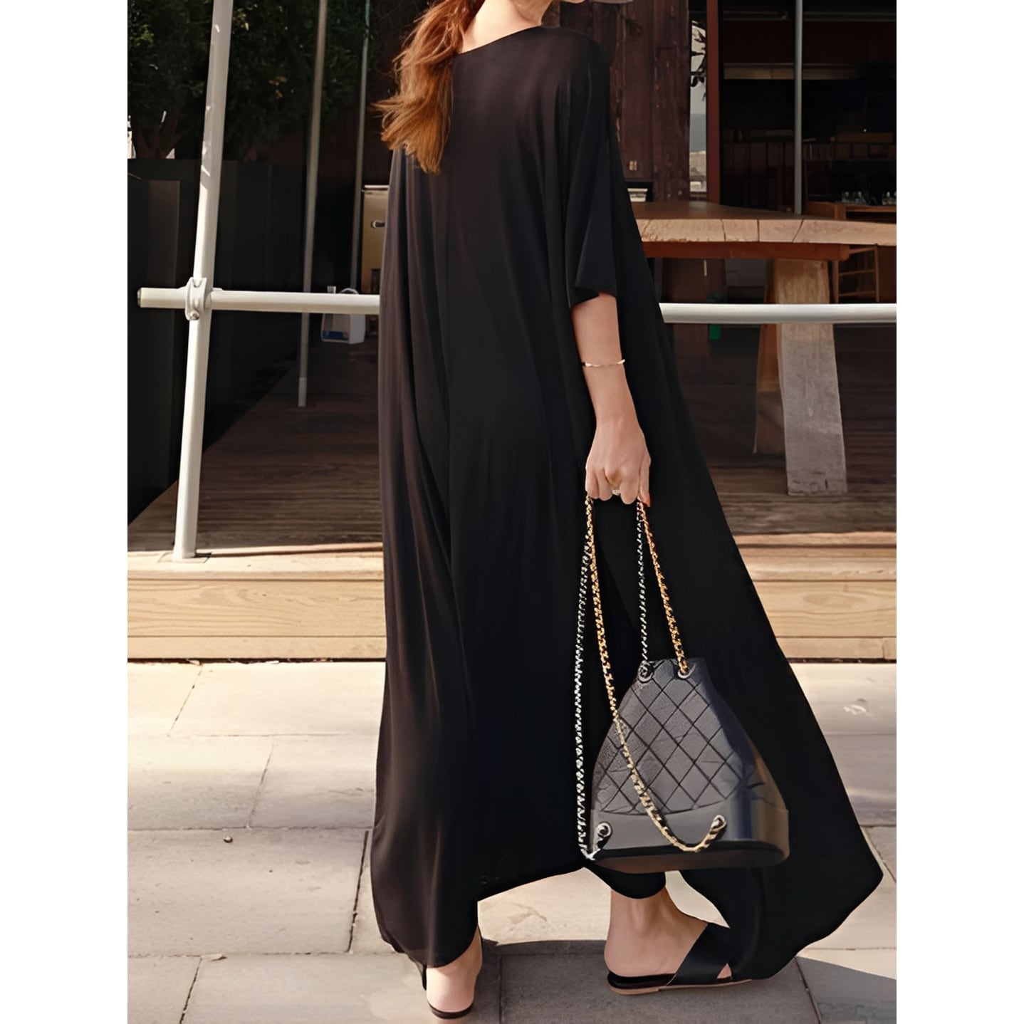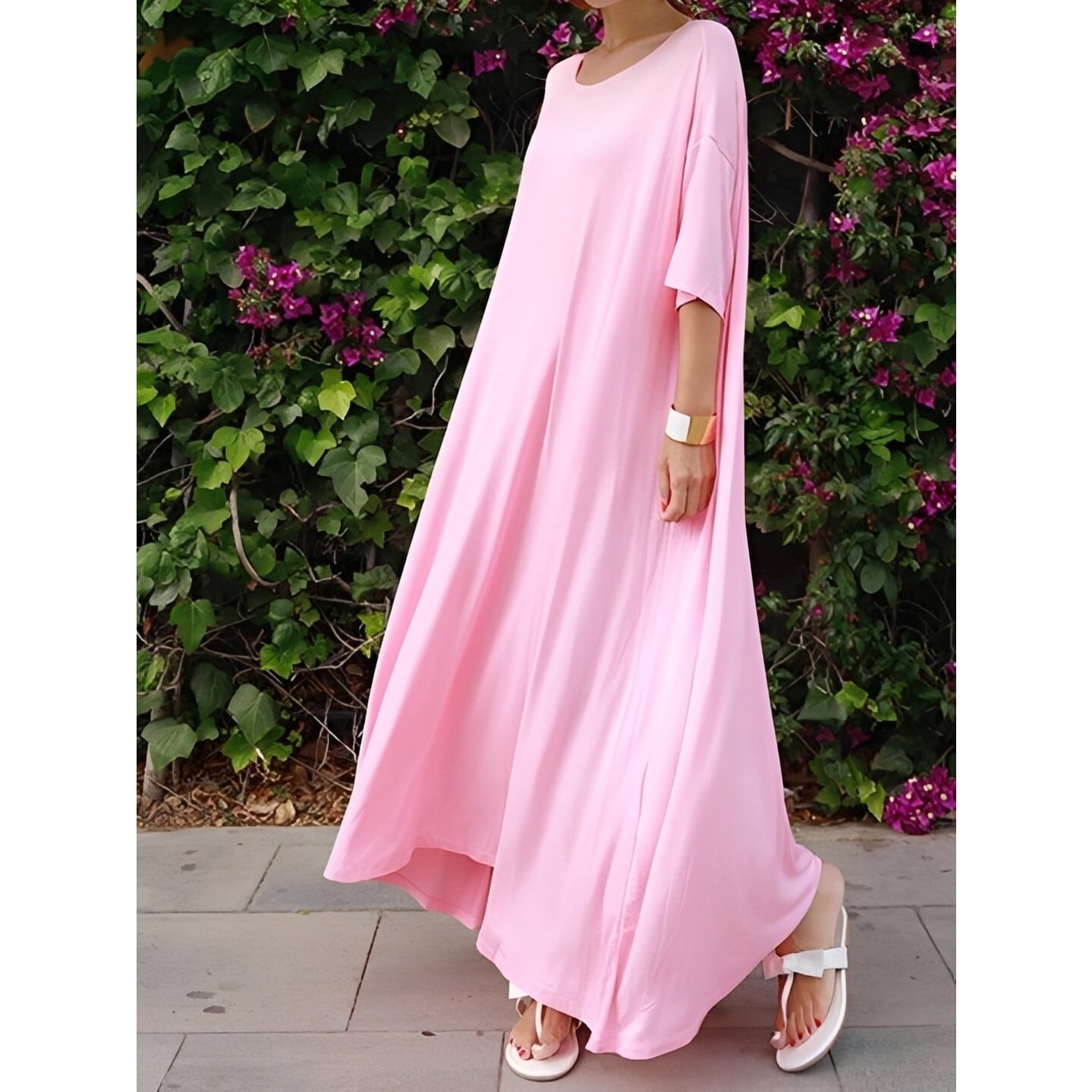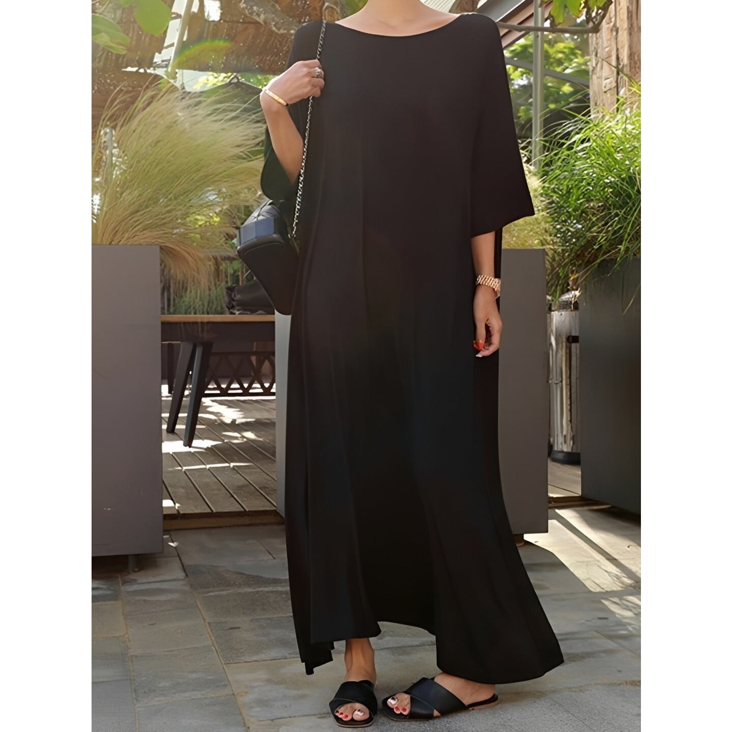 ゆったりとしたシルエットが優雅な印象を与えるロングワンピース。