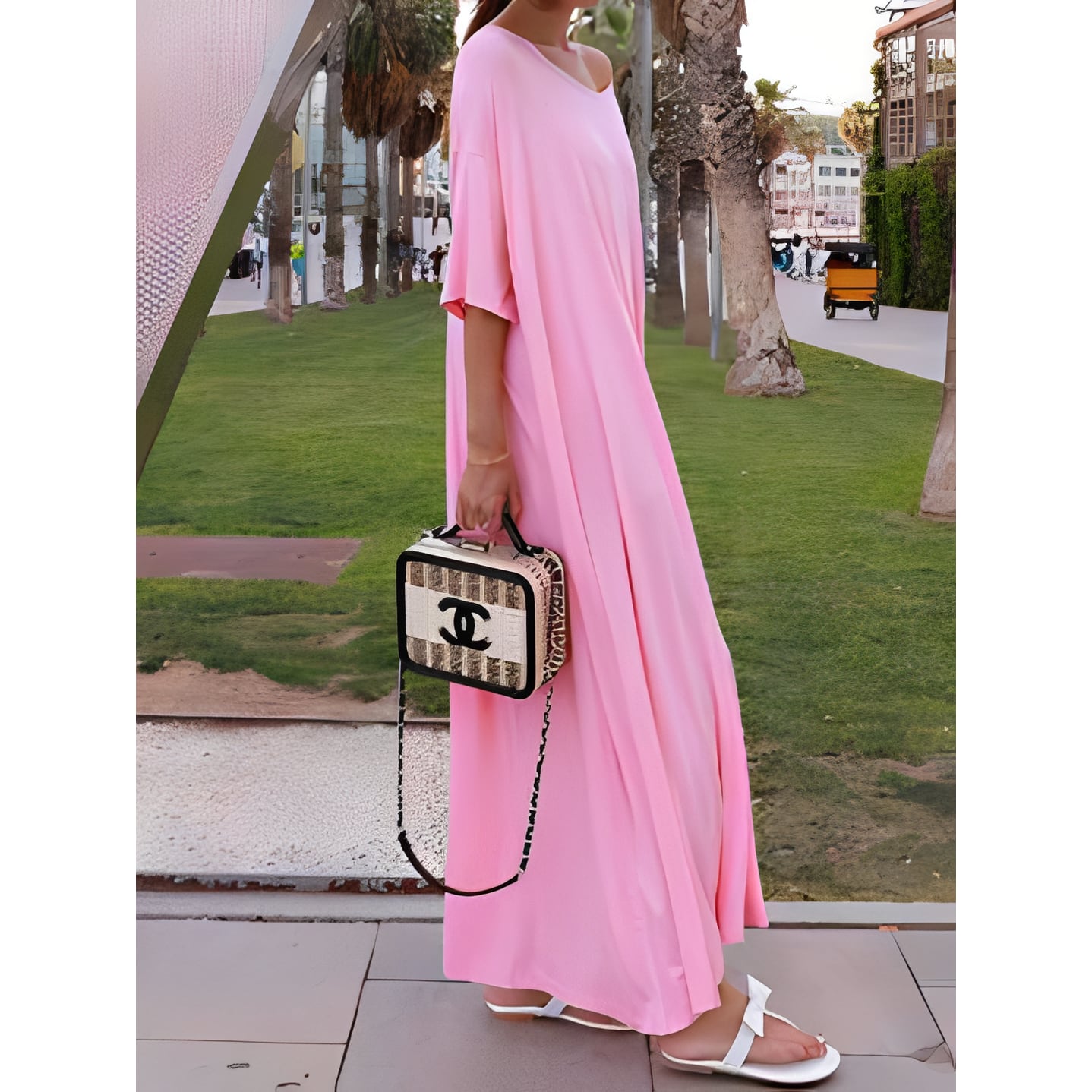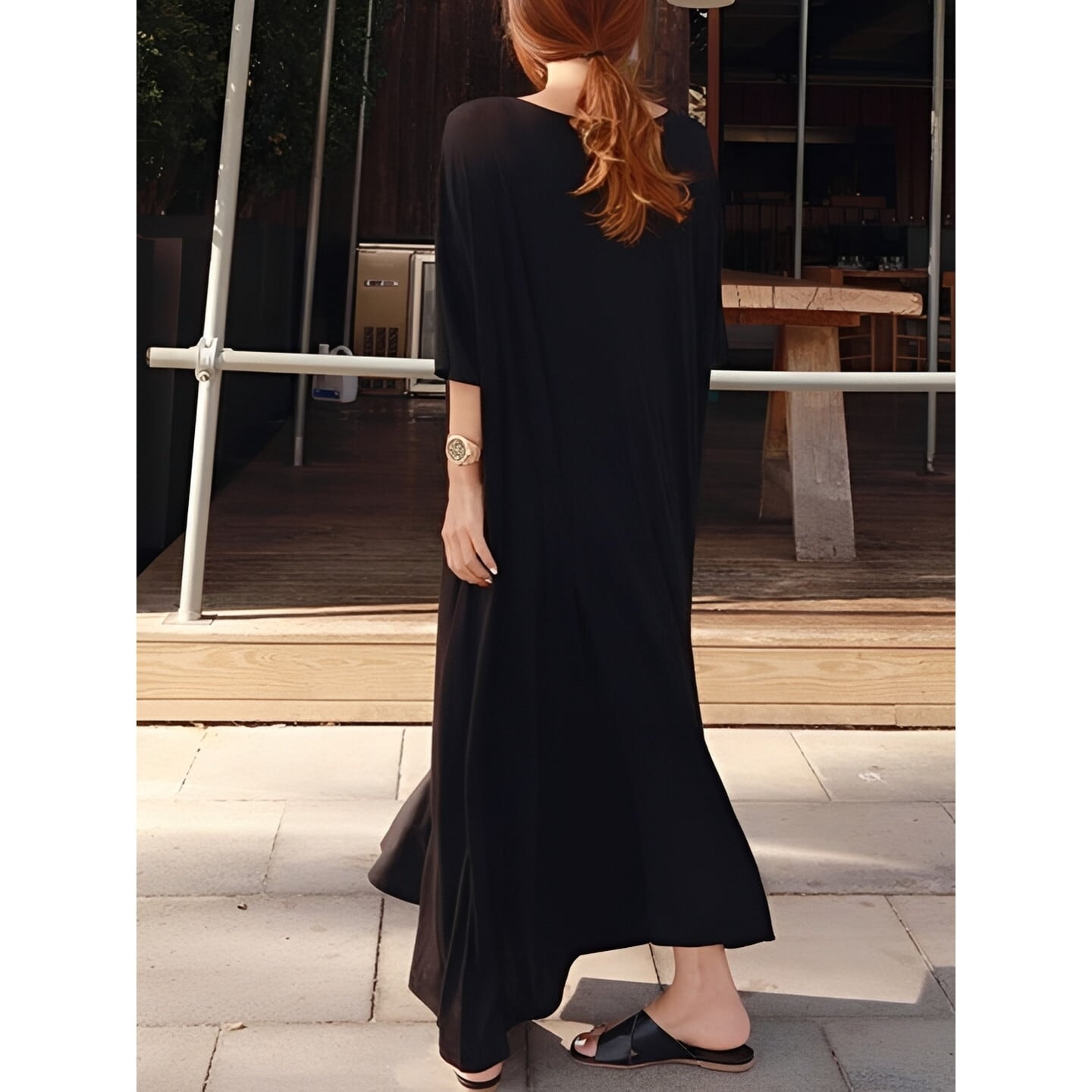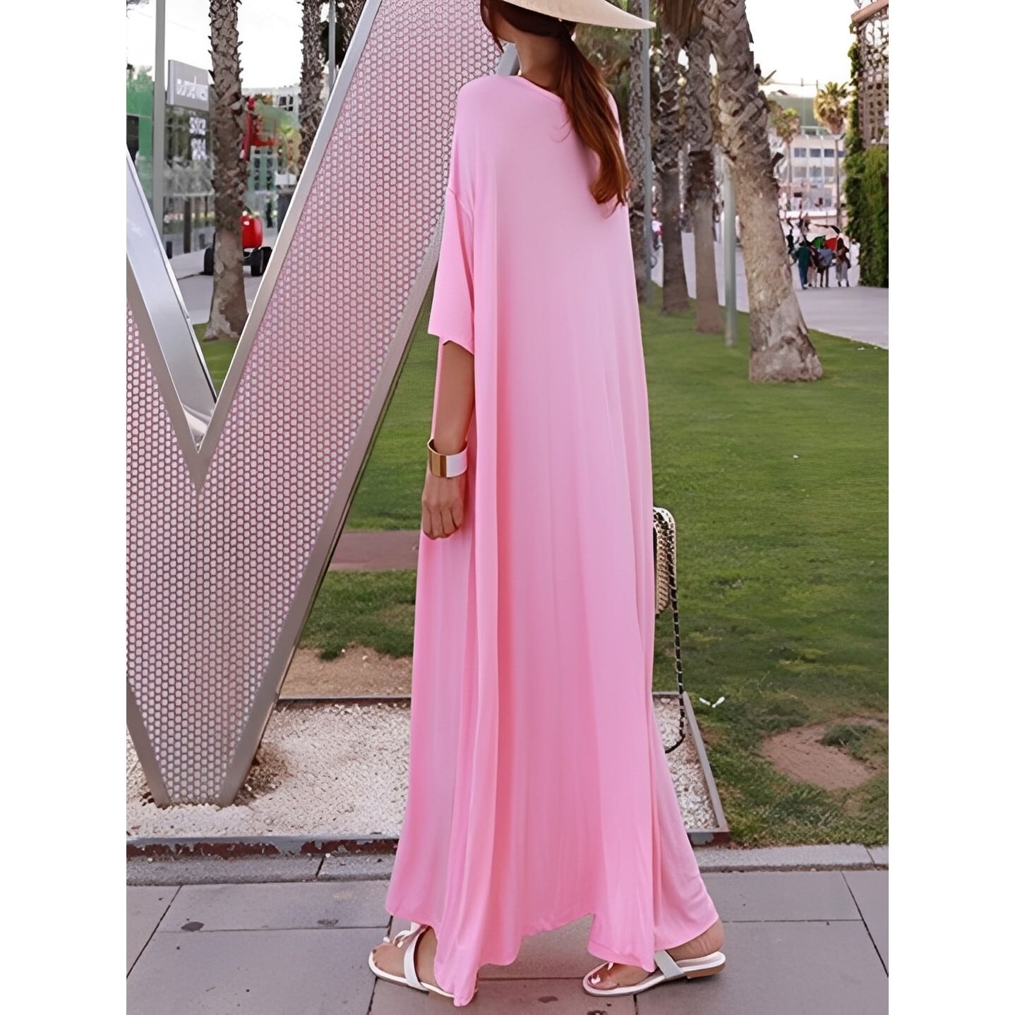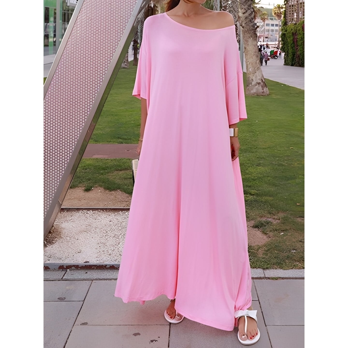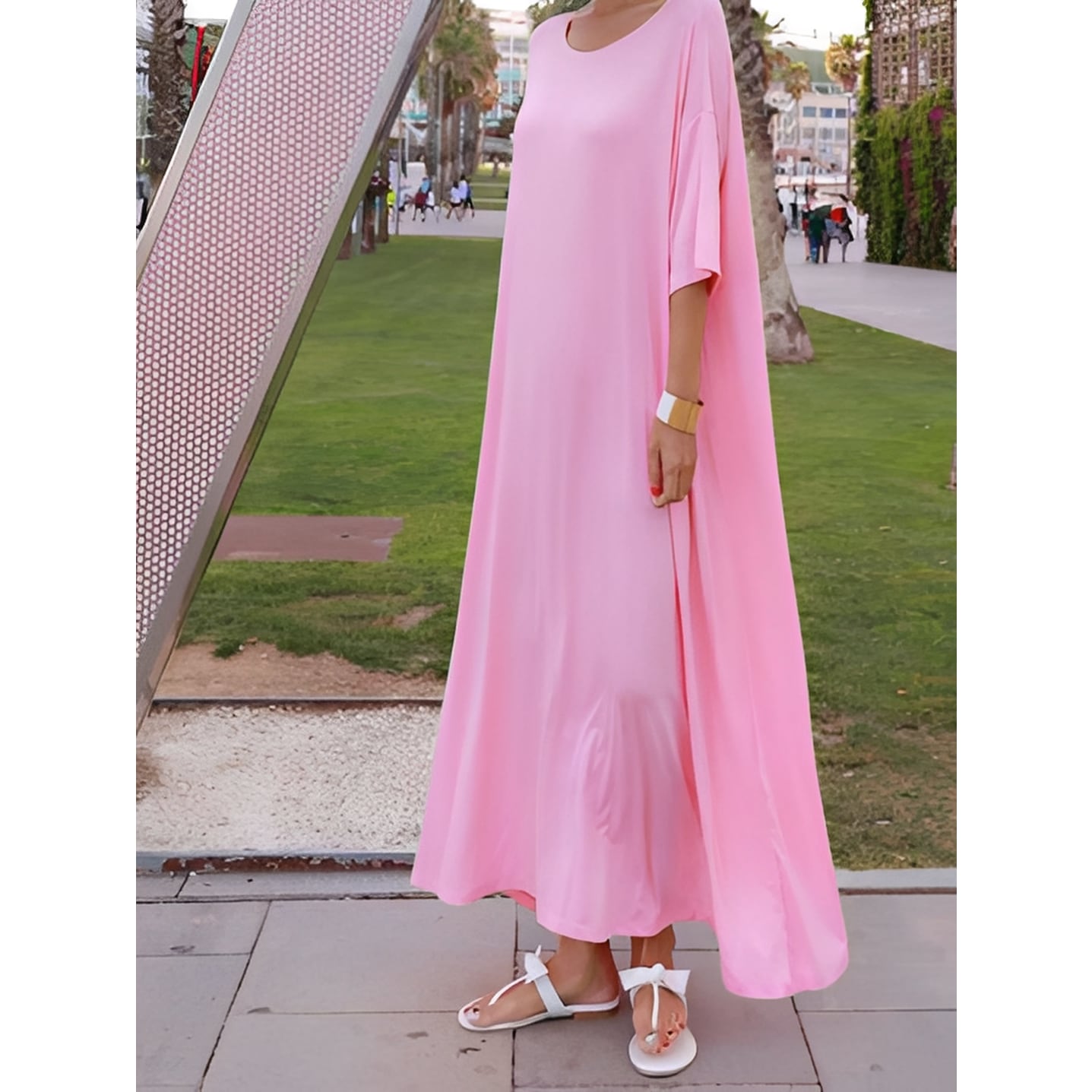 ゆったりとしたシルエットが優雅な印象を与えるロングワンピース。