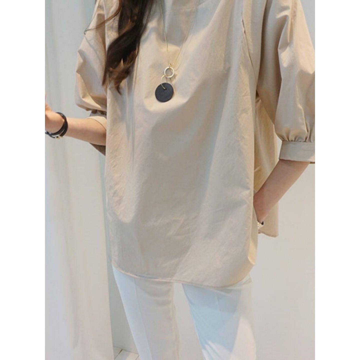 ゆとりのあるシルエットで体のラインを拾わず、すっきり見えも叶えます。