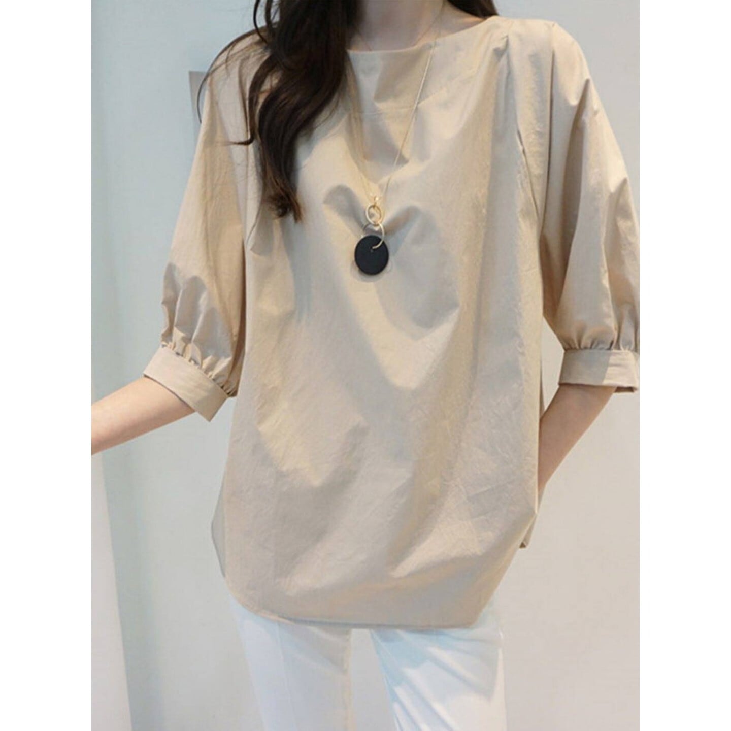 立体感のあるボリュームスリーブが、さりげなく華やぎを添える一枚◎